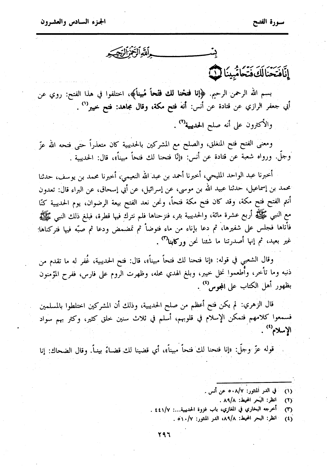 وَقَالَ الشَّعْبِيُّ فِي قَوْلِهِ: "إِنَّا فَتَحْنَا لَكَ فَتْحًا مُبِينًا"، قَالَ: فَتْحُ الْحُدَيْبِيَةِ، غَفَرَ لَهُ مَا تَقَدَّمَ مِنْ ذَنْبِهِ وَمَا تَأَخَّرَ، وَأُطْعِمُوا نَخْلَ خَيْبَرَ، وَبَلَغَ الْهَدْيُ مَحِلَّهُ، وَظَهَرَتِ الرُّومُ عَلَى فَارِسٍ، فَفَرِحَ الْمُؤْمِنُونَ بِظُهُورِ أَهْلِ الْكِتَابِ عَلَى الْمَجُوسِ. (4)