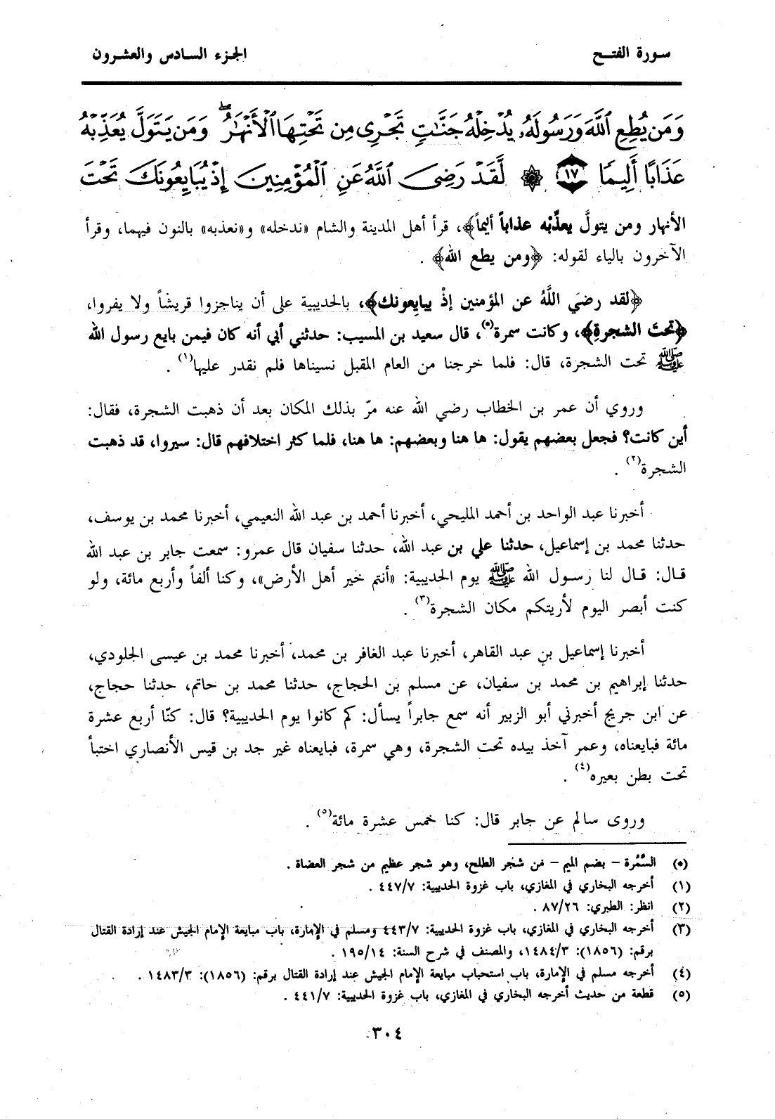 (4) أخرجه البخاري في المغازي، باب غزوة الحديبية: 7 / 443 ومسلم في الإمارة، باب مبايعة الإمام الجيش عند إرادة القتال برقم: (1856) : 3 / 1484، والمصنف في شرح السنة: 14 / 195.
