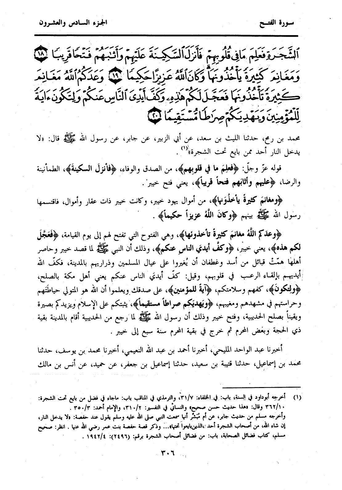 (1) أخرجه أبو داود في السنة، باب: في الخلفاء: 7 / 31، والترمذي في المناقب باب: ما جاء في فضل من بايع تحت الشجرة: 10 / 362 وقال: "هذا حديث حسن صحيح" والنسائي في التفسير: 2 / 310، والإمام أحمد: 3 / 350. وأخرجه مسلم من حديث جابر، عن أم مبشر أنها سمعت النبي صَلَّى اللَّهُ عَلَيْهِ وَسَلَّمَ يقول عند حفصة: "لا يدخل النار، إن شاء الله، من أصحاب الشجرة أحد، الذين بايعوا تحتها" ... وذكر قصة حفصة بنت عمر رضي الله عنها. انظر: صحيح مسلم، كتاب فضائل الصحابة، باب: من فضائل أصحاب الشجرة برقم: (2496) : 4 / 1942.