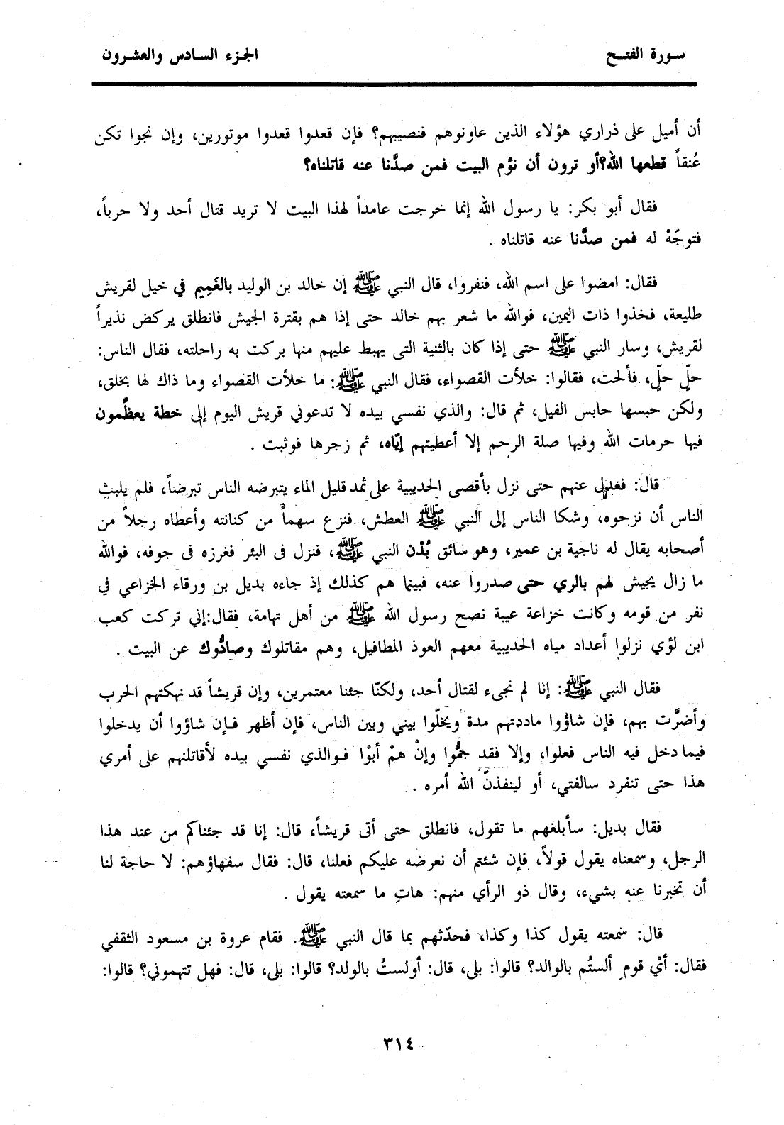 فَقَالَ النَّبِيُّ صَلَّى اللَّهُ عَلَيْهِ وَسَلَّمَ: " إِنَّا لَمْ نَجِئْ لِقِتَالِ أَحَدٍ، وَلَكِنَّا جِئْنَا مُعْتَمِرِينَ، وَإِنَّ قُرَيْشًا قَدْ نَهَكَتْهُمُ الْحَرْبُ وَأَضَرَّتْ بهم، فإن شاؤوا مَادَدْتُهُمْ مُدَّةً وَيُخَلُّوا بَيْنِي وَبَيْنَ النَّاسِ، فَإِنْ أظهر فإن شاؤوا أَنْ يَدْخُلُوا فِيمَا دَخَلَ فِيهِ النَّاسُ فَعَلُوا، وَإِلَّا فَقَدْ جُمُّوا وَإِنْ هُمْ أَبَوْا فَوَالَّذِي نَفْسِي بِيَدِهِ لَأُقَاتِلَنَّهُمْ عَلَى أَمْرِي هَذَا حَتَّى تَنْفَرِدَ سَالِفَتِي، أَوْ لَيُنْفِذَنَّ اللَّهُ أَمْرَهُ".