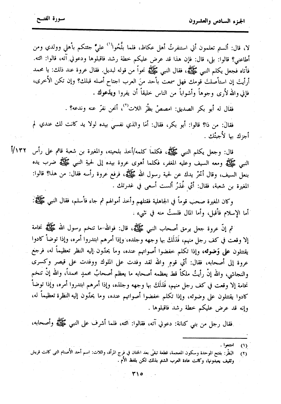 ثُمَّ إِنَّ عُرْوَةَ جَعَلَ يَرْمُقُ أَصْحَابَ النَّبِيِّ صَلَّى اللَّهُ عَلَيْهِ وَسَلَّمَ، قَالَ: فَوَاللَّهِ-مَا تَنَخَّمَ رَسُولُ اللَّهِ صَلَّى اللَّهُ عَلَيْهِ وَسَلَّمَ نُخَامَةً إِلَّا وَقَعَتْ فِي كَفِّ رَجُلٍ مِنْهُمْ، فَدَلَكَ بِهَا وَجْهَهُ وَجِلْدَهُ، وَإِذَا أَمَرَهُمُ ابْتَدَرُوا أَمْرَهُ، وَإِذَا تَوَضَّأَ كَادُوا يَقْتَتِلُونَ عَلَى وُضُوئِهِ، وَإِذَا تَكَلَّمَ خَفَضُوا أَصْوَاتَهُمْ عِنْدَهُ، وَمَا يَحُدُّونَ إِلَيْهِ النَّظَرَ تَعْظِيمًا لَهُ، فَرَجَعَ عُرْوَةُ إِلَى أَصْحَابِهِ، فَقَالَ: أَيْ قَوْمِ وَاللَّهِ لَقَدْ وَفَدْتُ عَلَى الْمُلُوكِ وَوَفَدْتُ عَلَى قَيْصَرَ وَكِسْرَى وَالنَّجَاشِيِّ، وَاللَّهِ إِنْ رَأَيْتُ مَلِكًا قَطُّ يُعَظِّمُهُ أَصْحَابُهُ مَا يُعَظِّمُ أَصْحَابُ مُحَمَّدٍ مُحَمَّدًا، وَاللَّهِ إِنْ تَنَخَّمَ نُخَامَةً إِلَّا وَقَعَتْ فِي كَفِّ رَجُلٍ مِنْهُمْ، فَدَلَكَ بِهَا وَجْهَهُ وَجِلْدَهُ، وَإِذَا أَمَرَهُمُ ابْتَدَرُوا أَمْرَهُ، وَإِذَا تَوَضَّأَ كَادُوا يَقْتَتِلُونَ عَلَى وُضُوئِهِ، وَإِذَا تَكَلَّمَ خَفَضُوا أَصْوَاتَهُمْ عِنْدَهُ، وَمَا يَحُدُّونَ إِلَيْهِ النَّظْرَةَ تَعْظِيمًا لَهُ، وَإِنَّهُ قَدْ عَرَضَ عَلَيْكُمْ خُطَّةَ رُشْدٍ فَاقْبَلُوهَا.