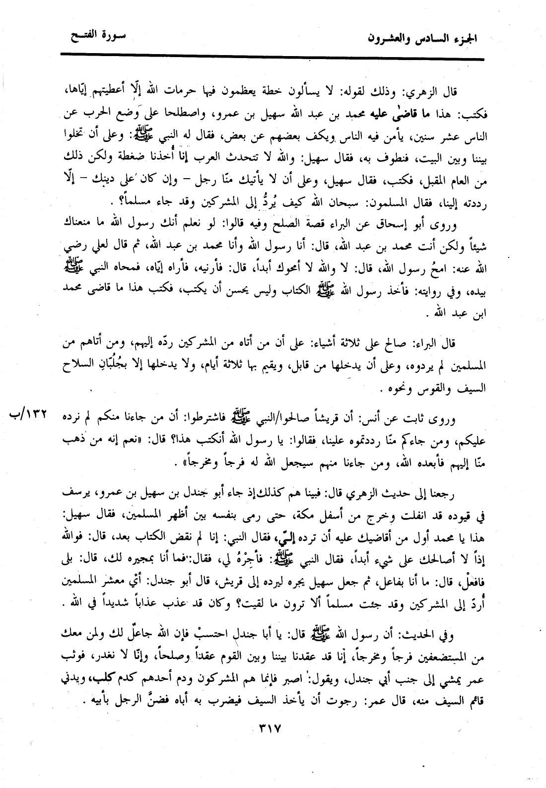 رَجَعْنَا إِلَى حَدِيثِ الزُّهْرِيِّ قَالَ: فَبَيْنَا هُمْ كَذَلِكَ إِذْ جَاءَ أَبُو جَنْدَلِ بْنُ سُهَيْلِ بْنِ عَمْرٍو، يَرْسُفُ فِي قُيُودِهِ قَدِ انْفَلَتَ وَخَرَجَ مِنْ أَسْفَلِ مَكَّةَ، حَتَّى رَمَى بِنَفْسِهِ بَيْنَ أَظْهُرِ الْمُسْلِمِينَ، فَقَالَ سُهَيْلٌ: هَذَا يَا مُحَمَّدُ أَوَّلُ مَنْ أُقَاضِيكَ عَلَيْهِ أَنْ تَرُدَّهُ إِلَيَّ، فَقَالَ النَّبِيُّ: إِنَّا لَمْ نَقْضِ الْكِتَابَ بَعْدُ، قال: فوالله إذا لَا أُصَالِحُكَ عَلَى شَيْءٍ أَبَدًا، فَقَالَ النَّبِيُّ صَلَّى اللَّهُ عَلَيْهِ وَسَلَّمَ: فَأَجِرْهُ لِي، فَقَالَ: فَمَا أَنَا بِمُجِيرِهِ لَكَ، قَالَ: بَلَى فَافْعَلْ، قَالَ: مَا أَنَا بِفَاعِلٍ، ثُمَّ جَعَلَ سُهَيْلٌ يَجُرُّهُ لِيَرُدَّهُ إِلَى قُرَيْشٍ، قَالَ أَبُو جَنْدَلٍ: أَيْ مَعْشَرَ الْمُسْلِمِينَ أَرُدُّ إِلَى الْمُشْرِكِينَ وَقَدْ جِئْتُ مُسْلِمًا أَلَا تَرَوْنَ مَا لَقِيتُ؟ وَكَانَ قَدْ عُذِّبَ عَذَابًا شَدِيدًا فِي اللَّهِ.