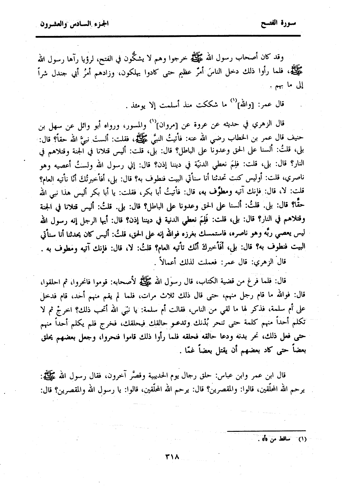 قَالَ الزُّهْرِيُّ فِي حَدِيثِهِ عَنْ عُرْوَةَ عَنْ [مَرْوَانَ] (2) وَالْمِسْوَرِ، وَرَوَاهُ أَبُو وَائِلٍ عَنْ سَهْلِ بْنِ حُنَيْفٍ قَالَ عُمَرُ بْنُ الْخَطَّابِ رَضِيَ اللَّهُ عَنْهُ: فَأَتَيْتُ النَّبِيَّ صَلَّى اللَّهُ عَلَيْهِ وَسَلَّمَ، فَقُلْتُ: أَلَسْتَ نَبِيَّ اللَّهِ حَقًّا؟ قَالَ: بَلَى، قُلْتُ: أَلَسْنَا عَلَى الْحَقِّ وَعَدُوُّنَا عَلَى الْبَاطِلِ؟ قَالَ: بَلَى، قُلْتُ: أَلَيْسَ قَتْلَانَا فِي الْجَنَّةِ وَقَتْلَاهُمْ فِي النَّارِ؟ قَالَ: بَلَى، قُلْتُ: فَلِمَ نُعْطِي الدَّنِيَّةَ فِي دِينِنَا إِذَنْ؟ قَالَ: إِنِّي رَسُولُ اللَّهِ وَلَسْتُ أَعْصِيهِ وَهُوَ نَاصِرِي، قُلْتُ: أَوَلَيْسَ كُنْتَ تُحَدِّثُنَا أَنَّا سَنَأْتِي الْبَيْتَ فَنَطُوفُ بِهِ؟ قَالَ: بَلَى، أَفَأَخْبَرْتُكَ أَنَّا نَأْتِيهِ الْعَامَ؟ قُلْتُ: لَا قَالَ: فَإِنَّكَ آتِيهِ وَمُطَوِّفٌ بِهِ، قَالَ: فَأَتَيْتُ أَبَا بَكْرٍ، فَقُلْتُ: يَا أَبَا بَكْرٍ أَلَيْسَ هَذَا نَبِيُّ اللَّهِ حَقًّا؟ قَالَ: بَلَى. قُلْتُ: أَلَسْنَا عَلَى الْحَقِّ وَعَدُوُّنَا عَلَى الْبَاطِلِ؟ قَالَ: بَلَى. قُلْتُ: أَلَيْسَ قَتْلَانَا فِي الْجَنَّةِ وَقَتْلَاهُمْ فِي النَّارِ؟ قَالَ: بَلَى، قُلْتُ: فَلِمَ نُعْطِي الدَّنِيَّةَ فِي دِينِنَا إِذَنْ؟ قَالَ: أَيُّهَا الرَّجُلُ إِنَّهُ رَسُولُ اللَّهِ لَيْسَ يَعْصِي رَبَّهُ وَهُوَ نَاصِرُهُ، فَاسْتَمْسِكْ بِغَرْزِهِ فَوَاللَّهِ إِنَّهُ عَلَى الْحَقِّ، قُلْتُ: أَلَيْسَ كَانَ يُحَدِّثُنَا أَنَّا سَنَأْتِي الْبَيْتَ فَنَطُوفُ بِهِ؟ قَالَ: بَلَى، أَفَأَخْبَرَكَ أَنَّكَ تَأْتِيهِ الْعَامَ؟ قُلْتُ: لَا قَالَ: فَإِنَّكَ آتِيهِ وَمُطَوِّفٌ بِهِ.