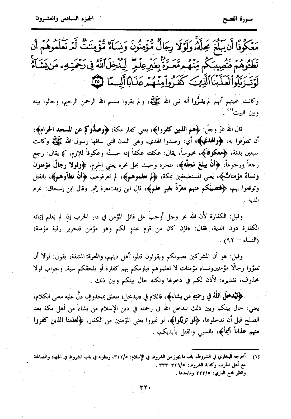 قَالَ اللَّهُ عَزَّ وَجَلَّ: {هُمُ الَّذِينَ كَفَرُوا} يَعْنِي كُفَّارَ مَكَّةَ، {وَصَدُّوكُمْ عَنِ الْمَسْجِدِ الْحَرَامِ} أَنْ تَطُوفُوا بِهِ، {وَالْهَدْيَ} أَيْ: وَصَدُّوا الْهَدْيَ، وَهِيَ الْبُدْنُ الَّتِي سَاقَهَا رَسُولُ اللَّهِ صَلَّى اللَّهُ عَلَيْهِ وَسَلَّمَ وَكَانَتْ سَبْعِينَ بَدَنَةً، {مَعْكُوفًا} مَحْبُوسًا، يُقَالُ: عَكَفْتُهُ عَكْفًا إِذَا حَبَسْتُهُ وَعُكُوفًا لَازِمٌ، كَمَا يُقَالُ: رَجَعَ رَجْعًا وَرُجُوعًا، {أَنْ يَبْلُغَ مَحِلَّهُ} مَنْحَرَهُ وَحَيْثُ يَحُلُّ نَحْرُهُ يَعْنِي الْحَرَمَ، {وَلَوْلَا رِجَالٌ مُؤْمِنُونَ وَنِسَاءٌ مُؤْمِنَاتٌ} يَعْنِي الْمُسْتَضْعَفِينَ بِمَكَّةَ، {لَمْ تَعْلَمُوهُمْ} لَمْ تعرفوهم، {أَنْ تَطَأوهم} بِالْقَتْلِ وَتُوقِعُوا بِهِمْ، {فَتُصِيبَكُمْ مِنْهُمْ مَعَرَّةٌ بِغَيْرِ عِلْمٍ} قَالَ ابْنُ زَيْدٍ: مَعَرَّةٌ إِثْمٌ. وَقَالَ ابْنُ إِسْحَاقَ: غُرْمُ الدِّيَةِ.