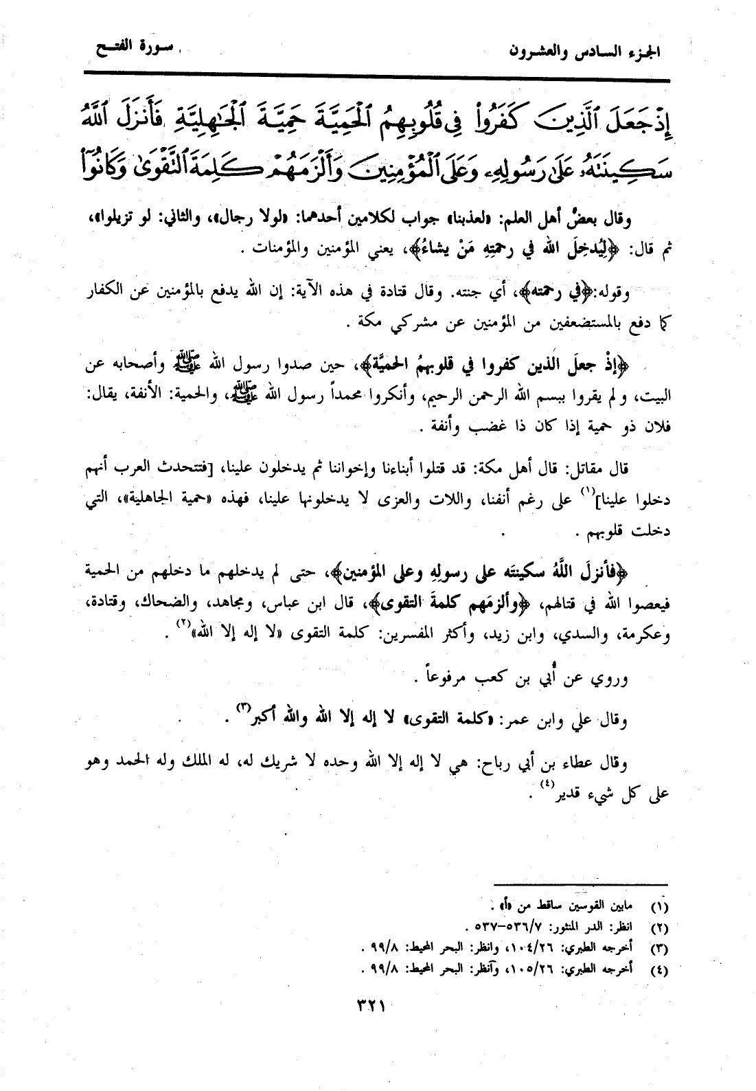 {إِذْ جَعَلَ الَّذِينَ كَفَرُوا فِي قُلُوبِهِمُ الْحَمِيَّةَ حَمِيَّةَ الْجَاهِلِيَّةِ فَأَنْزَلَ اللَّهُ سَكِينَتَهُ عَلَى رَسُولِهِ وَعَلَى الْمُؤْمِنِينَ وَأَلْزَمَهُمْ كَلِمَةَ التَّقْوَى وَكَانُوا أَحَقَّ بِهَا وَأَهْلَهَا وَكَانَ اللَّهُ بِكُلِ شَيْءٍ عَلِيمًا (26) }