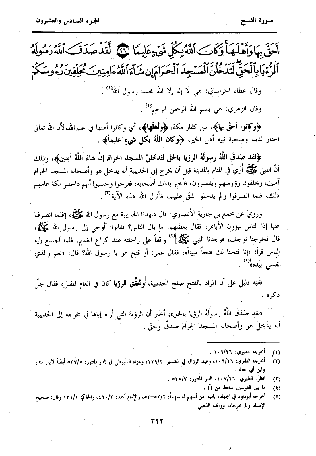 {لَقَدْ صَدَقَ اللَّهُ رَسُولَهُ الرُّؤْيَا بِالْحَقِّ لَتَدْخُلُنَّ الْمَسْجِدَ الْحَرَامَ إِنْ شَاءَ اللَّهُ آمِنِينَ} وَذَلِكَ أَنَّ النَّبِيَّ صَلَّى اللَّهُ عَلَيْهِ وَسَلَّمَ أُرِيَ فِي الْمَنَامِ بِالْمَدِينَةِ قَبْلَ أَنْ يَخْرُجَ إِلَى الْحُدَيْبِيَةِ أَنَّهُ يَدْخُلُ هُوَ وَأَصْحَابُهُ الْمَسْجِدَ الْحَرَامَ آمنين، ويحلقون رؤوسهم وَيُقَصِّرُونَ، فَأَخْبَرَ بِذَلِكَ أَصْحَابَهُ، فَفَرِحُوا وَحَسِبُوا أَنَّهُمْ دَاخِلُو مَكَّةَ عَامَهُمْ ذَلِكَ، فَلَمَّا انْصَرَفُوا وَلَمْ يَدْخُلُوا شَقَّ عَلَيْهِمْ، فَأَنْزَلَ اللَّهُ هَذِهِ الْآيَةَ (3) .