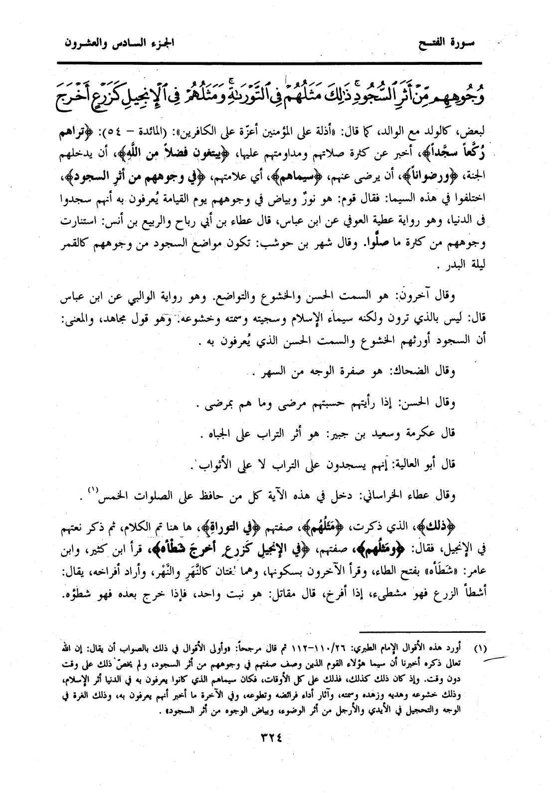 (1) أورد هذه الأقوال الإمام الطبري: 26 / 110-112 ثم قال مرجحًا: "وأولى الأقوال في ذلك بالصواب أن يقال: إن الله تعالى ذكره أخبرنا أن سيما هؤلاء القوم الذين وصف صفتهم في وجوههم من أثر السجود، ولم يخص ذلك على وقت دون وقت. وإذ كان ذلك كذلك، فذلك على كل الأوقات، فكان سيماهم الذي كانوا يعرفون به في الدنيا أثر الإسلام، وذلك خشوعه وهديه وزهده وسمته، وآثار أداء فرائضه وتطوعه، وفي الآخرة ما أخبر أنهم يعرفون به، وذلك الغرة في الوجه والتحجيل في الأيدي والأرجل من أثر الوضوء، وبياض الوجوه من أثر السجود.