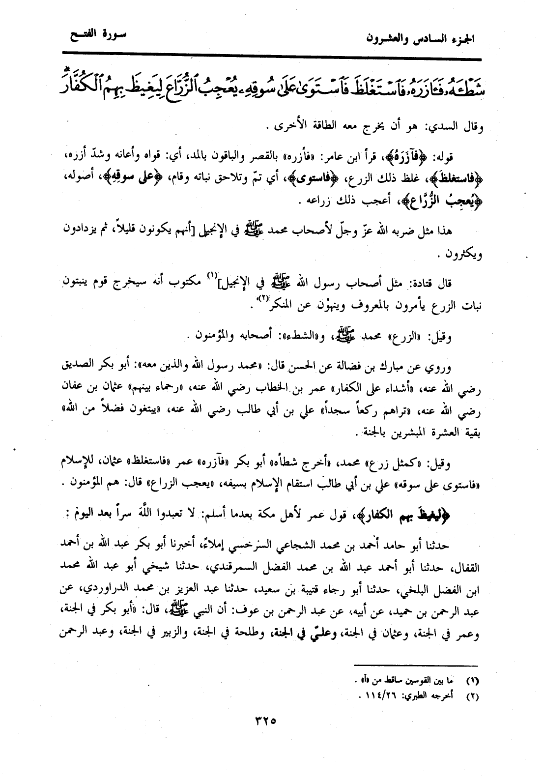 وَقِيلَ: "كَمَثَلِ زَرْعٍ" مُحَمَّدٌ، "أَخْرَجَ شَطْأَهُ" أَبُو بَكْرٍ "فَآزَرَهُ" عُمَرُ "فَاسْتَغْلَظَ" عُثْمَانُ، لِلْإِسْلَامِ "فَاسْتَوَى عَلَى سُوقِهِ" عَلِيُّ بْنُ أَبِي طَالِبٍ اسْتَقَامَ الْإِسْلَامُ بِسَيْفِهِ، "يُعْجِبُ الزُّرَّاعَ" قَالَ: هُمُ الْمُؤْمِنُونَ.