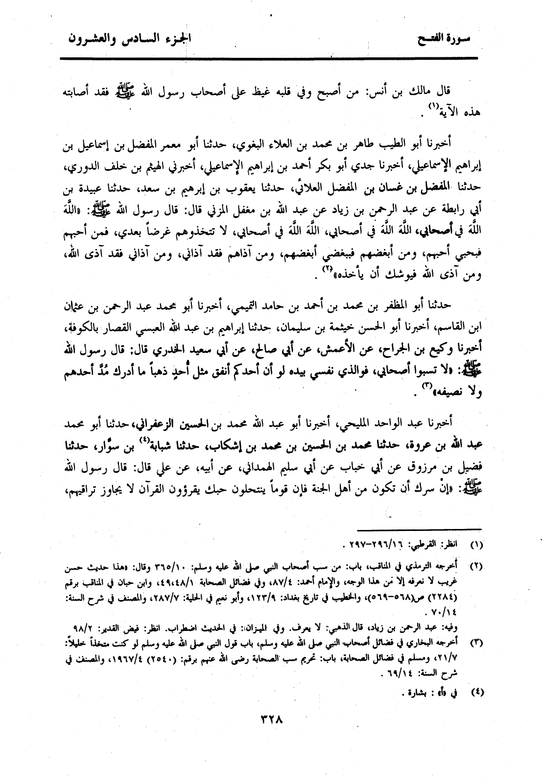 (2) أخرجه الترمذي في المناقب، باب: من سب أصحاب النبي صَلَّى اللَّهُ عَلَيْهِ وَسَلَّمَ: 10 / 365 وقال: "هذا حديث حسن غريب لا نعرفه إلا من هذا الوجه، والإمام أحمد: 4 / 87، وفي فضائل الصحابة 1 / 48،49، وابن حبان في المناقب برقم (2284) ص (568-569) ، والخطيب في تاريخ بغداد: 9 / 123، وأبو نعيم في الحلية: 7 / 287، والمصنف في شرح السنة: 14 / 70. وفيه: عبد الرحمن بن زياد، قال الذهبي: لا يعرف. وفي الميزان: في الحديث اضطراب. انظر: فيض القدير: 2 / 98.