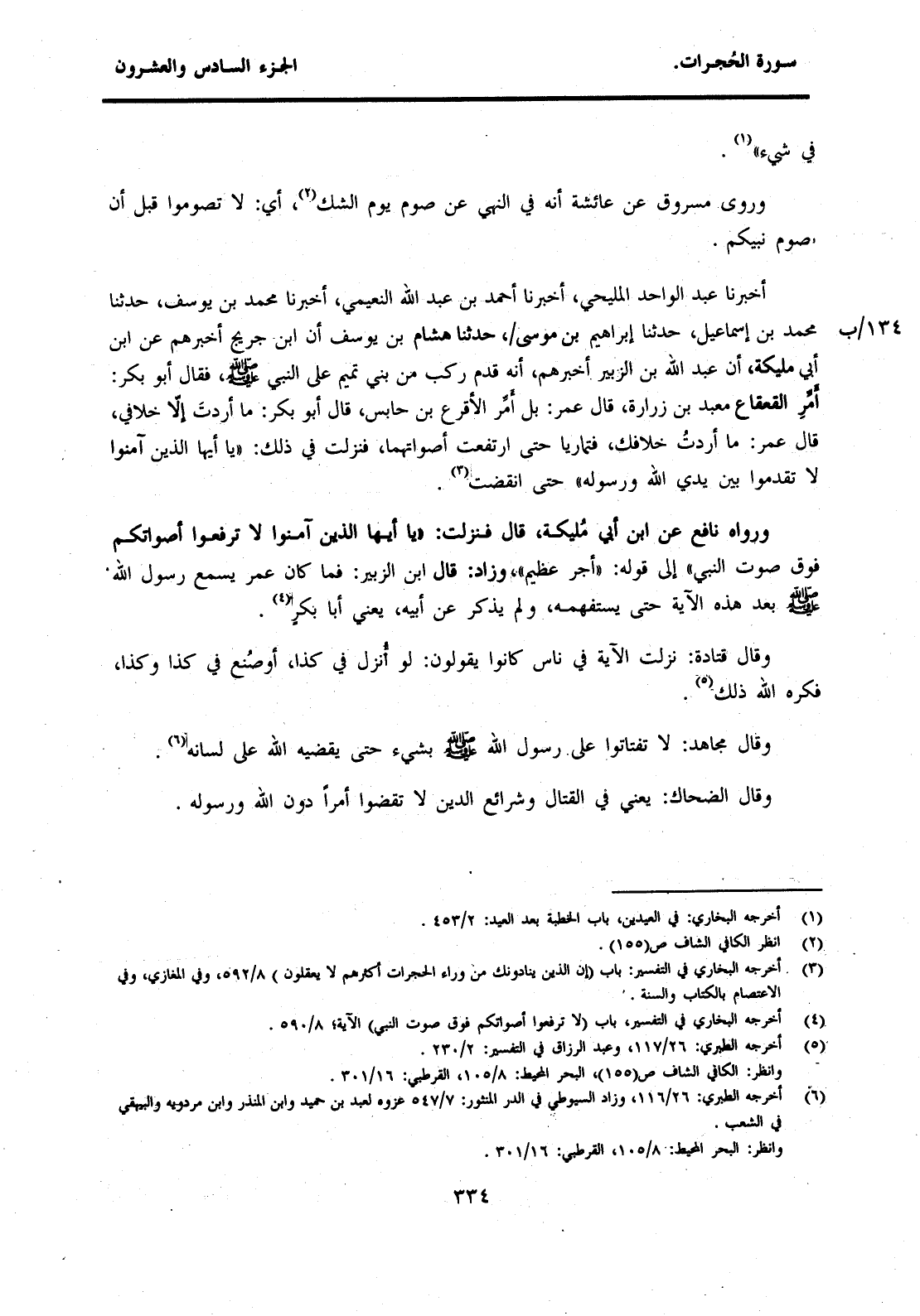 (5) أخرجه الطبري: 26 / 117، وعبد الرزاق في التفسير: 2 / 230. وانظر: الكافي الشاف ص (155) ، البحر المحيط: 8 / 105، القرطبي: 16 / 301.