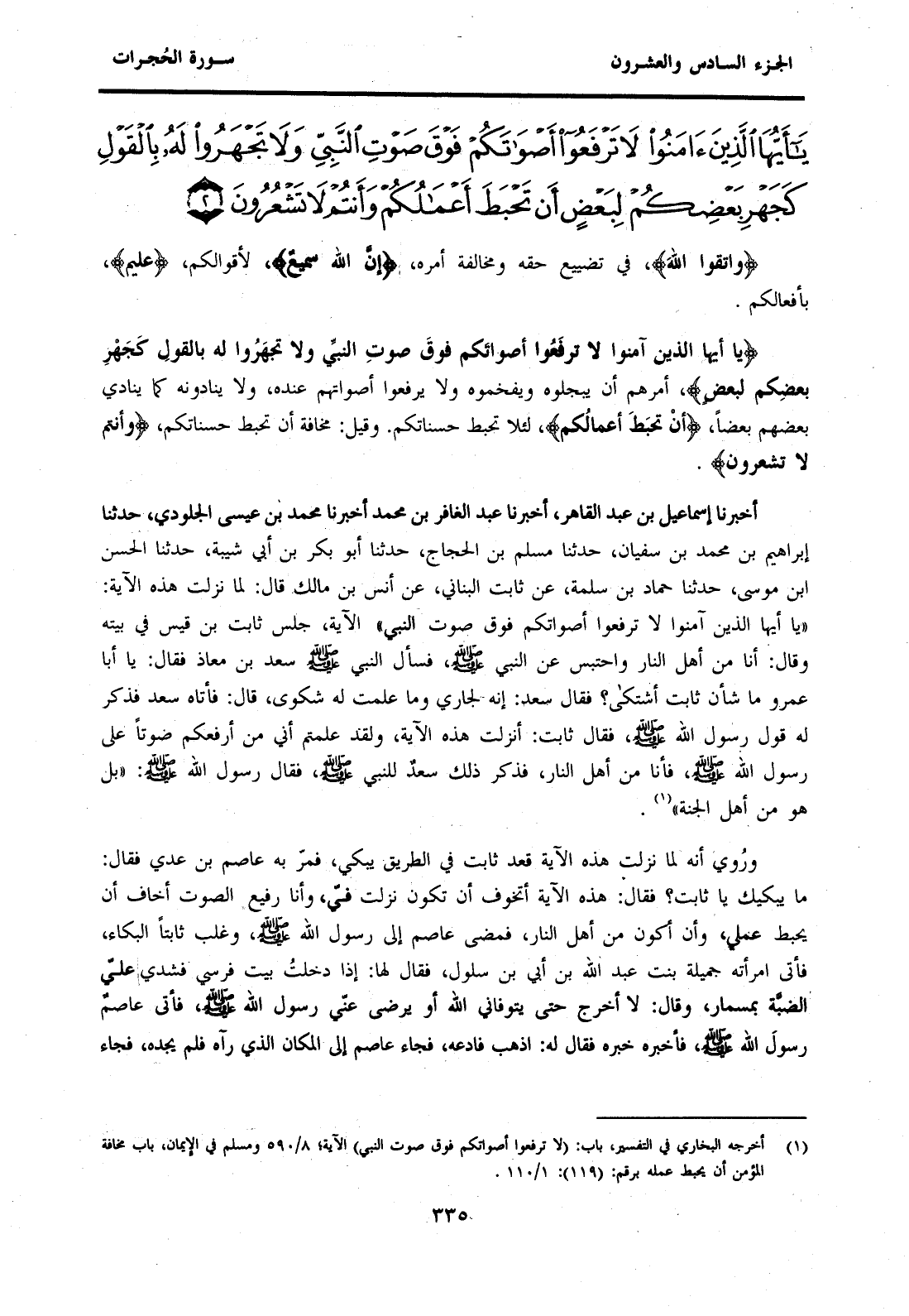 (1) أخرجه البخاري في التفسير، باب: (لا ترفعوا أصواتكم فوق صوت النبي) الآية، 8 / 590 ومسلم في الإيمان، باب مخافة المؤمن أن يحبط عمله برقم: (119) : 1 / 110.