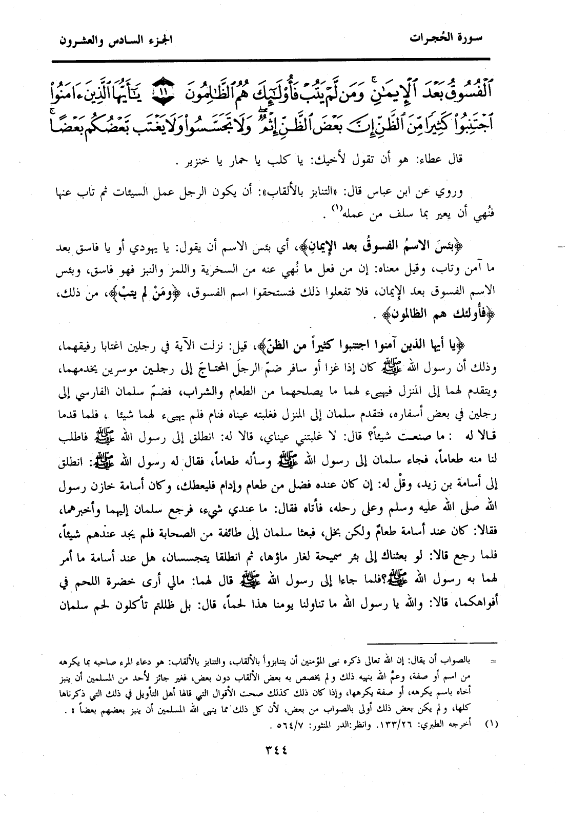 {يَا أَيُّهَا الَّذِينَ آمَنُوا اجْتَنِبُوا كَثِيرًا مِنَ الظَّنِّ} قِيلَ: نَزَلَتِ الْآيَةُ فِي رَجُلَيْنِ اغْتَابَا رَفِيقَهُمَا، وَذَلِكَ أَنَّ رَسُولَ اللَّهِ صَلَّى اللَّهُ عَلَيْهِ وَسَلَّمَ كَانَ إِذَا غَزَا أَوْ سَافَرَ ضَمَّ الرَّجُلَ الْمُحْتَاجَ إِلَى رَجُلَيْنِ مُوسِرَيْنِ يَخْدِمُهُمَا، وَيَتَقَدَّمُ لَهُمَا إِلَى الْمَنْزِلِ فَيُهَيِّئُ لَهُمَا مَا يُصْلِحُهُمَا مِنَ الطَّعَامِ وَالشَّرَابِ، فَضَمَّ سَلْمَانَ الْفَارِسِيَّ إِلَى رَجُلَيْنِ فِي بَعْضِ أَسْفَارِهِ، فَتَقَدَّمَ سَلْمَانُ إِلَى الْمَنْزِلِ فَغَلَبَتْهُ عَيْنَاهُ فَنَامَ فَلَمْ يُهَيِّئْ لَهُمَا شَيْئًا، فَلَمَّا قَدِمَا قَالَا لَهُ: مَا صَنَعْتَ شَيْئًا؟ قَالَ: لَا غَلَبَتْنِي عَيْنَايَ، قَالَا لَهُ: انْطَلِقْ إِلَى رَسُولِ اللَّهِ صَلَّى اللَّهُ عَلَيْهِ وَسَلَّمَ فَاطْلُبْ لَنَا مِنْهُ طَعَامًا، فَجَاءَ سَلْمَانُ إِلَى رَسُولِ اللَّهِ صَلَّى اللَّهُ عَلَيْهِ وَسَلَّمَ وَسَأَلَهُ طَعَامًا، فَقَالَ لَهُ رَسُولُ اللَّهِ صَلَّى اللَّهُ عَلَيْهِ وَسَلَّمَ: انْطَلِقْ إِلَى أُسَامَةَ بْنَ زَيْدٍ، وَقُلْ لَهُ: إِنْ كَانَ عِنْدَهُ فَضْلٌ مِنْ طَعَامٍ وَإِدَامٍ فَلْيُعْطِكَ، وَكَانَ أُسَامَةُ خَازِنَ رَسُولِ اللَّهِ صَلَّى اللَّهُ عَلَيْهِ وَسَلَّمَ وَعَلَى رَحْلِهِ، فَأَتَاهُ فَقَالَ: مَا عِنْدِي شَيْءٌ، فَرَجَعَ سَلْمَانُ إِلَيْهِمَا وَأَخْبَرَهُمَا، فَقَالَا كَانَ عِنْدَ أُسَامَةَ طَعَامٌ وَلَكِنْ بَخِلَ، فَبَعَثَا سَلْمَانَ إِلَى طَائِفَةٍ مِنَ الصَّحَابَةِ فَلَمْ يَجِدْ عِنْدَهُمْ شَيْئًا، فَلَمَّا رَجَعَ قَالَا لَوْ بَعَثْنَاكَ إِلَى بِئْرِ سُمَيْحَةَ لَغَارَ مَاؤُهَا، ثُمَّ انْطَلَقَا يَتَجَسَّسَانِ، هَلْ عِنْدَ أُسَامَةَ مَا أَمَرَ لَهُمَا بِهِ رَسُولُ اللَّهِ صَلَّى اللَّهُ عَلَيْهِ وَسَلَّمَ؟ فَلَمَّا جَاءَا إِلَى رَسُولِ اللَّهِ صَلَّى اللَّهُ عَلَيْهِ وَسَلَّمَ قال لهما: "مالي أَرَى خُضْرَةَ اللَّحْمِ فِي أَفْوَاهِكُمَا"، قَالَا وَاللَّهِ يَا رَسُولَ اللَّهِ مَا تَنَاوَلْنَا يَوْمَنَا هَذَا لَحْمًا، قَالَ: بَلْ ظَلَلْتُمْ تَأْكُلُونَ لَحْمَ سَلْمَانَ