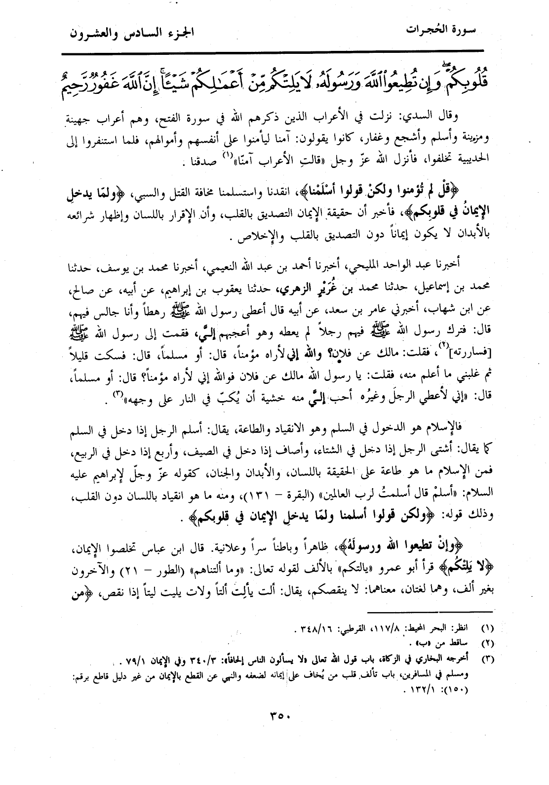 (3) أخرجه البخاري في الزكاة، باب قول الله تعالى "لا يسألون الناس إلحافا": 3 / 340 وفي الإيمان 1 / 79. ومسلم في المسافرين، باب تألف قلب من يخاف على إيمانه لضعفه والنهي عن القطع بالإيمان من غير دليل قاطع برقم: (150) : 1 / 132.