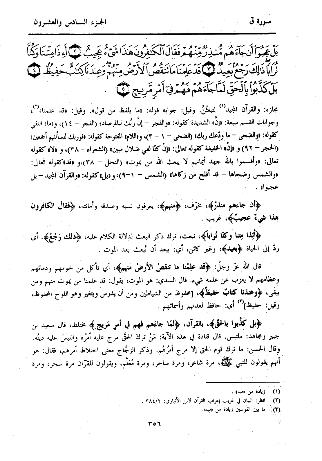 وَ"بَلْ" كَقَوْلِهِ: "وَالْقُرْآنِ الْمَجِيدِ -بَلْ عَجِبُوا".