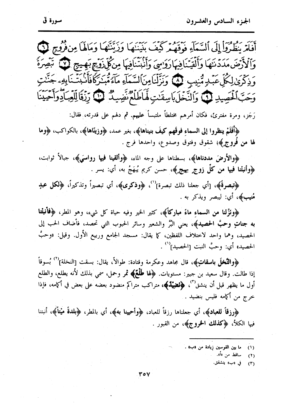 {أَفَلَمْ يَنْظُرُوا إِلَى السَّمَاءِ فَوْقَهُمْ كَيْفَ بَنَيْنَاهَا وَزَيَّنَّاهَا وَمَا لَهَا مِنْ فُرُوجٍ (6) وَالْأَرْضَ مَدَدْنَاهَا وَأَلْقَيْنَا فِيهَا رَوَاسِيَ وَأَنْبَتْنَا فِيهَا مِنْ كُلِّ زَوْجٍ بَهِيجٍ (7) تَبْصِرَةً وَذِكْرَى لِكُلِ عَبْدٍ مُنِيبٍ (8) وَنَزَّلْنَا مِنَ السَّمَاءِ مَاءً مُبَارَكًا فَأَنْبَتْنَا بِهِ جَنَّاتٍ وَحَبَّ الْحَصِيدِ (9) وَالنَّخْلَ بَاسِقَاتٍ لَهَا طَلْعٌ نَضِيدٌ (10) رِزْقًا لِلْعِبَادِ وَأَحْيَيْنَا بِهِ بَلْدَةً مَيْتًا كَذَلِكَ الْخُرُوجُ (11) }