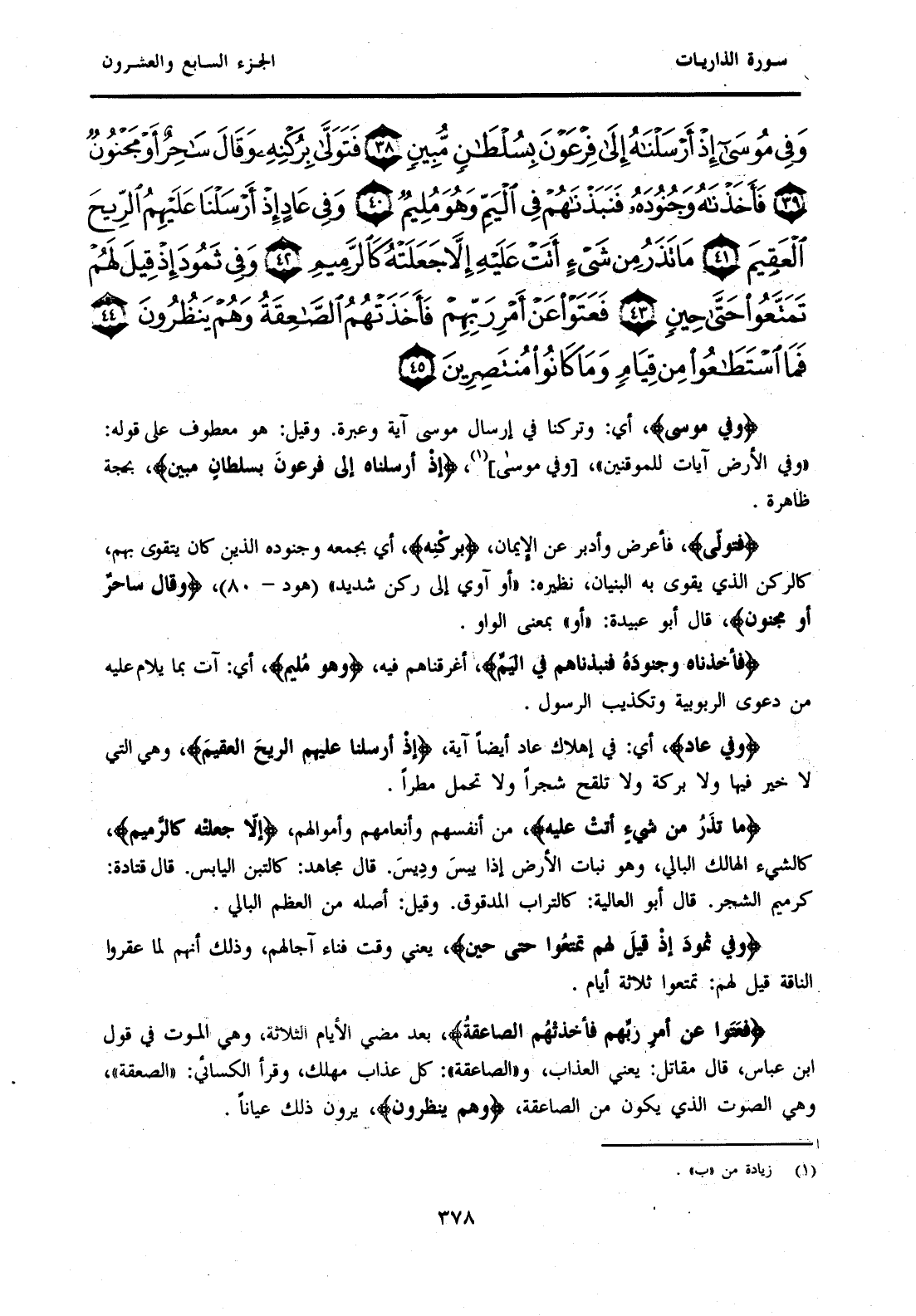 {وَفِي مُوسَى إِذْ أَرْسَلْنَاهُ إِلَى فِرْعَوْنَ بِسُلْطَانٍ مُبِينٍ (38) فَتَوَلَّى بِرُكْنِهِ وَقَالَ سَاحِرٌ أَوْ مَجْنُونٌ (39) فَأَخَذْنَاهُ وَجُنُودَهُ فَنَبَذْنَاهُمْ فِي الْيَمِّ وَهُوَ مُلِيمٌ (40) وَفِي عَادٍ إِذْ أَرْسَلْنَا عَلَيْهِمُ الرِّيحَ الْعَقِيمَ (41) مَا تَذَرُ مِنْ شَيْءٍ أَتَتْ عَلَيْهِ إِلَّا جَعَلَتْهُ كَالرَّمِيمِ (42) وَفِي ثَمُودَ إِذْ قِيلَ لَهُمْ تَمَتَّعُوا حَتَّى حِينٍ (43) فَعَتَوْا عَنْ أَمْرِ رَبِّهِمْ فَأَخَذَتْهُمُ الصَّاعِقَةُ وَهُمْ يَنْظُرُونَ (44) فَمَا اسْتَطَاعُوا مِنْ قِيَامٍ وَمَا كَانُوا مُنْتَصِرِينَ (45) }