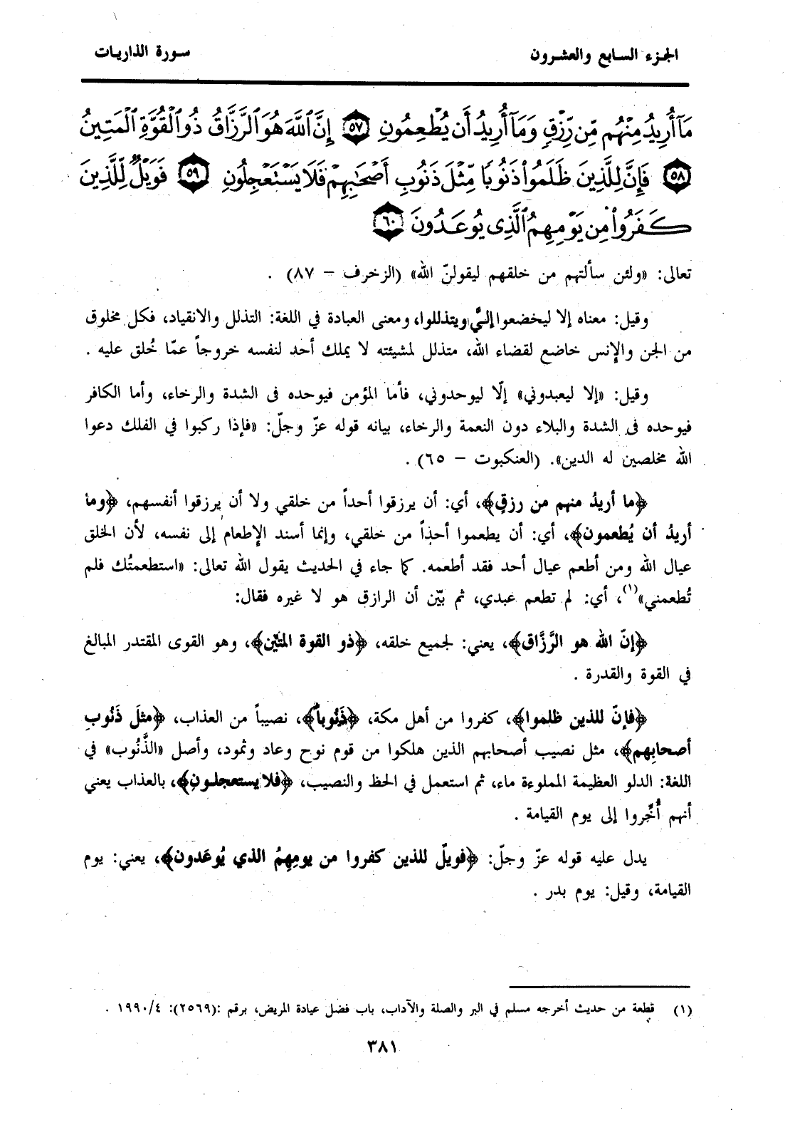 {مَا أُرِيدُ مِنْهُمْ مِنْ رِزْقٍ وَمَا أُرِيدُ أَنْ يُطْعِمُونِ (57) إِنَّ اللَّهَ هُوَ الرَّزَّاقُ ذُو الْقُوَّةِ الْمَتِينُ (58) فَإِنَّ لِلَّذِينَ ظَلَمُوا ذَنُوبًا مِثْلَ ذَنُوبِ أَصْحَابِهِمْ فَلَا يَسْتَعْجِلُونِ (59) فَوَيْلٌ لِلَّذِينَ كَفَرُوا مِنْ يَوْمِهِمُ الَّذِي يُوعَدُونَ (60) }