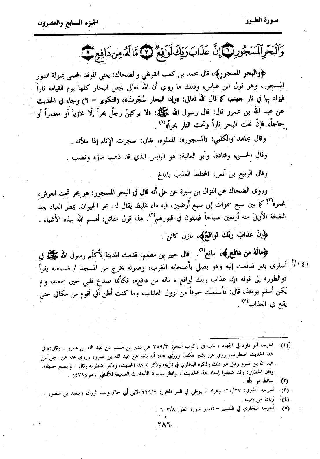 {وَالْبَحْرِ الْمَسْجُورِ} قَالَ مُحَمَّدُ بْنُ كَعْبٍ الْقُرَظِيُّ وَالضَّحَّاكُ: يَعْنِي الْمُوقَدَ الْمُحْمَى بِمَنْزِلَةِ التَّنُّورِ الْمَسْجُورِ، وَهُوَ قَوْلُ ابْنِ عَبَّاسٍ، وَذَلِكَ مَا رُوِيَ أَنَّ اللَّهَ تَعَالَى يَجْعَلُ الْبِحَارَ كُلَّهَا يَوْمَ الْقِيَامَةِ نَارًا فَيُزَادُ بِهَا فِي نَارِ جَهَنَّمَ، كَمَا قَالَ اللَّهُ تَعَالَى: "وَإِذَا الْبِحَارُ سُجِّرَتْ"، (التَّكْوِيرِ-6) وَجَاءَ فِي الْحَدِيثِ عَنْ عَبْدِ اللَّهِ بْنِ عَمْرٍو قَالَ: قَالَ رَسُولُ اللَّهِ صَلَّى اللَّهُ عَلَيْهِ وَسَلَّمَ: "لَا يَرْكَبَنَّ رَجُلٌ بَحْرًا إِلَّا غَازِيًا أَوْ مُعْتَمِرًا أَوْ حَاجًّا، فَإِنَّ تَحْتَ الْبَحْرِ نَارًا وَتَحْتَ النَّارِ بَحْرًا" (1) .