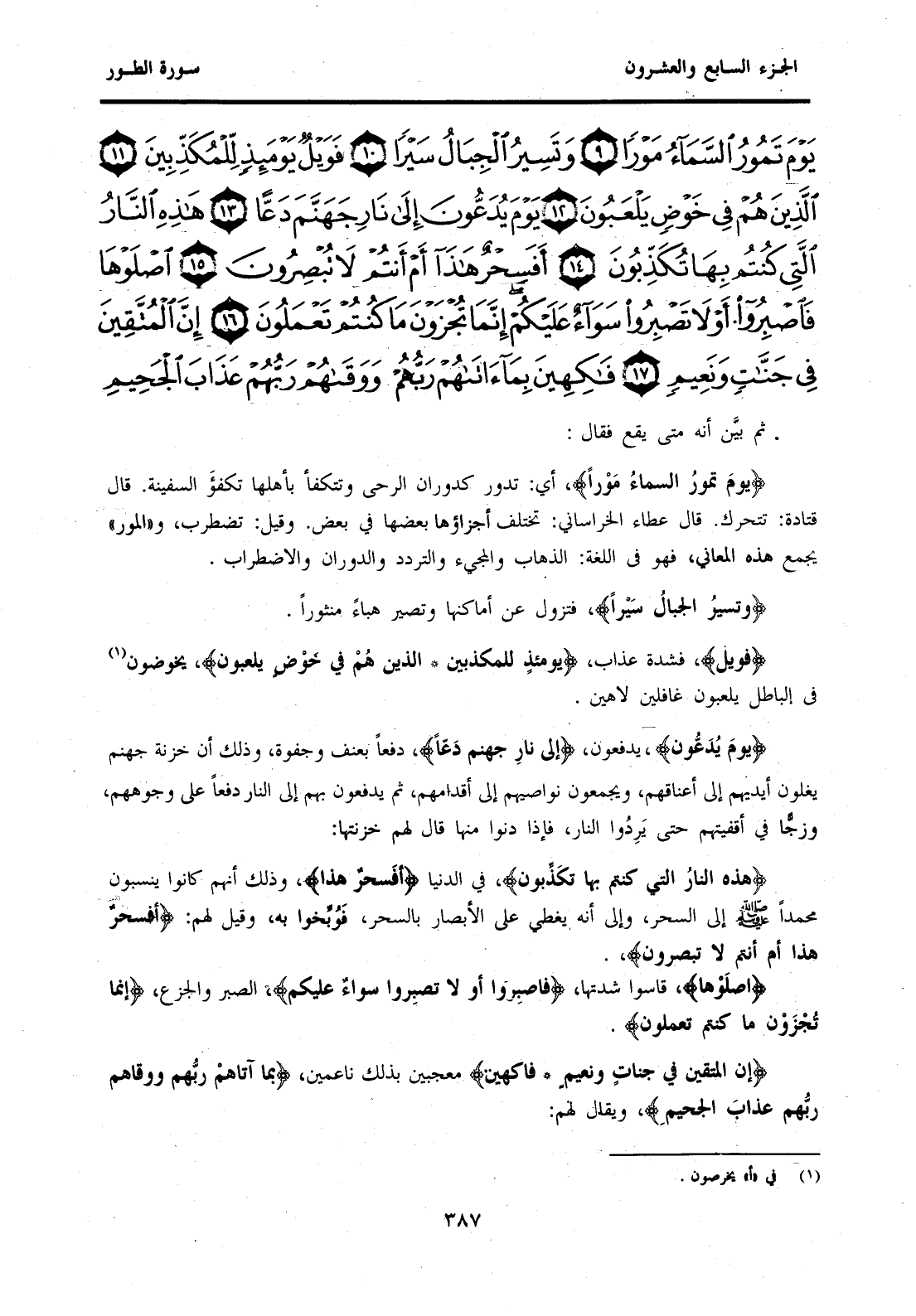 {يَوْمَ تَمُورُ السَّمَاءُ مَوْرًا (9) وَتَسِيرُ الْجِبَالُ سَيْرًا (10) فَوَيْلٌ يَوْمَئِذٍ لِلْمُكَذِّبِينَ (11) الَّذِينَ هُمْ فِي خَوْضٍ يَلْعَبُونَ (12) يَوْمَ يُدَعُّونَ إِلَى نَارِ جَهَنَّمَ دَعًّا (13) هَذِهِ النَّارُ الَّتِي كُنْتُمْ بِهَا تُكَذِّبُونَ (14) }