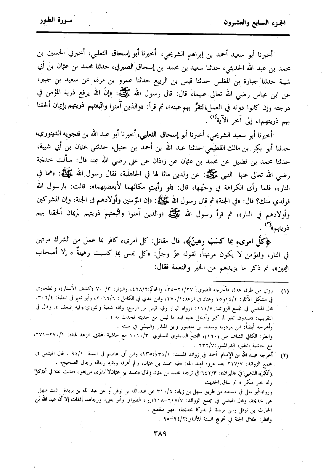 أَخْبَرَنَا أَبُو سَعِيدٍ أَحْمَدُ بْنُ إِبْرَاهِيمَ الشَّرِيحِيُّ، أَخْبَرَنَا أَبُو إِسْحَاقَ الثَّعْلَبِيُّ، أَخْبَرَنِي الْحُسَيْنُ بْنُ مُحَمَّدِ بْنِ عَبْدِ اللَّهِ الْحَدِيثِيُّ، حَدَّثَنَا سَعِيدُ بْنُ مُحَمَّدِ بْنِ إِسْحَاقَ الصَّيْرَفِيُّ، حَدَّثَنَا مُحَمَّدُ بْنُ عُثْمَانَ بْنِ أَبِي شَيْبَةَ، حَدَّثَنَا جُبَارَةُ بْنُ الْمُغَلِّسِ، حَدَّثَنَا قَيْسُ بْنُ الرَّبِيعِ، حَدَّثَنَا عَمْرُو بْنُ مُرَّةَ، عَنْ سَعِيدِ بْنِ جُبَيْرٍ، عَنِ ابْنِ عَبَّاسٍ رَضِيَ اللَّهُ تَعَالَى عَنْهُمَا، قَالَ: قَالَ رَسُولُ اللَّهِ صَلَّى اللَّهُ عَلَيْهِ وَسَلَّمَ: "إِنَّ اللَّهَ يَرْفَعُ ذُرِّيَّةَ الْمُؤْمِنِ فِي دَرَجَتِهِ وَإِنْ كَانُوا دُونَهُ فِي الْعَمَلِ، لِتَقَرَّ بِهِمْ عَيْنُهُ"، ثُمَّ قَرَأَ: "وَالَّذِينَ آمَنُوا وَاتَّبَعَتْهُمْ ذُرِّيَّتُهُمْ بِإِيمَانٍ أَلْحَقْنَا بِهِمْ ذُرِّيَّتَهُمْ"، إِلَى آخَرِ الْآيَةِ (1) .