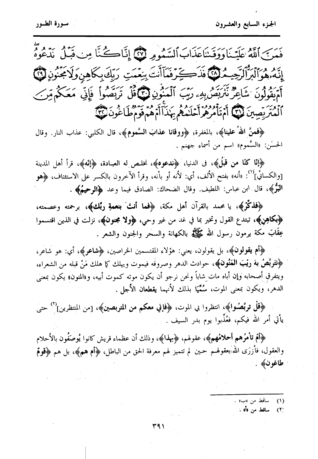 {فَمَنَّ اللَّهُ عَلَيْنَا وَوَقَانَا عَذَابَ السَّمُومِ (27) إِنَّا كُنَّا مِنْ قَبْلُ نَدْعُوهُ إِنَّهُ هُوَ الْبَرُّ الرَّحِيمُ (28) فَذَكِّرْ فَمَا أَنْتَ بِنِعْمَةِ رَبِّكَ بِكَاهِنٍ وَلَا مَجْنُونٍ (29) أَمْ يَقُولُونَ شَاعِرٌ نَتَرَبَّصُ بِهِ رَيْبَ الْمَنُونِ (30) قُلْ تَرَبَّصُوا فَإِنِّي مَعَكُمْ مِنَ الْمُتَرَبِّصِينَ (31) }