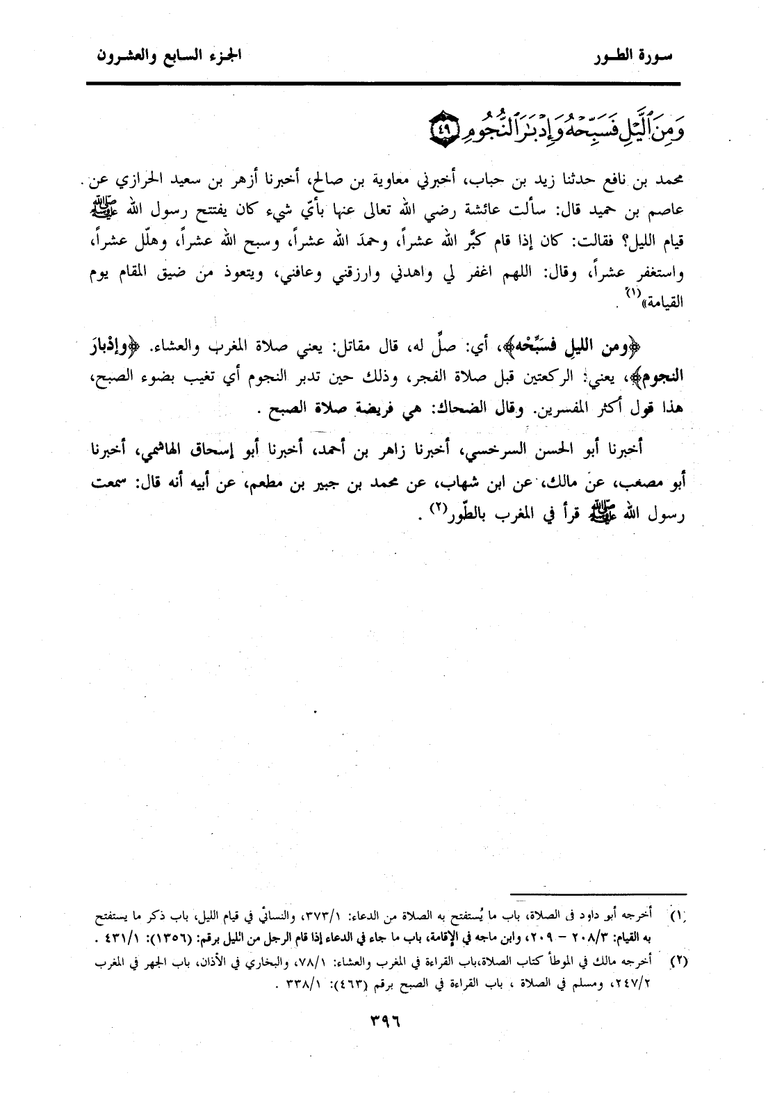 {وَمِنَ اللَّيْلِ فَسَبِّحْهُ} أَيْ: صَلِّ لَهُ، قَالَ مُقَاتِلٌ: يَعْنِي صَلَاةَ الْمَغْرِبِ وَالْعَشَاءِ. {وَإِدْبَارَ النُّجُومِ} يَعْنِي الرَّكْعَتَيْنِ قَبْلَ صَلَاةِ الْفَجْرِ، وَذَلِكَ حِينَ تُدْبِرُ النُّجُومُ أَيْ تَغِيبُ بِضَوْءِ الصُّبْحِ، هَذَا قَوْلُ أَكْثَرِ الْمُفَسِّرِينَ. وَقَالَ الضَّحَّاكُ: هُوَ فَرِيضَةُ صَلَاةِ الصُّبْحِ.