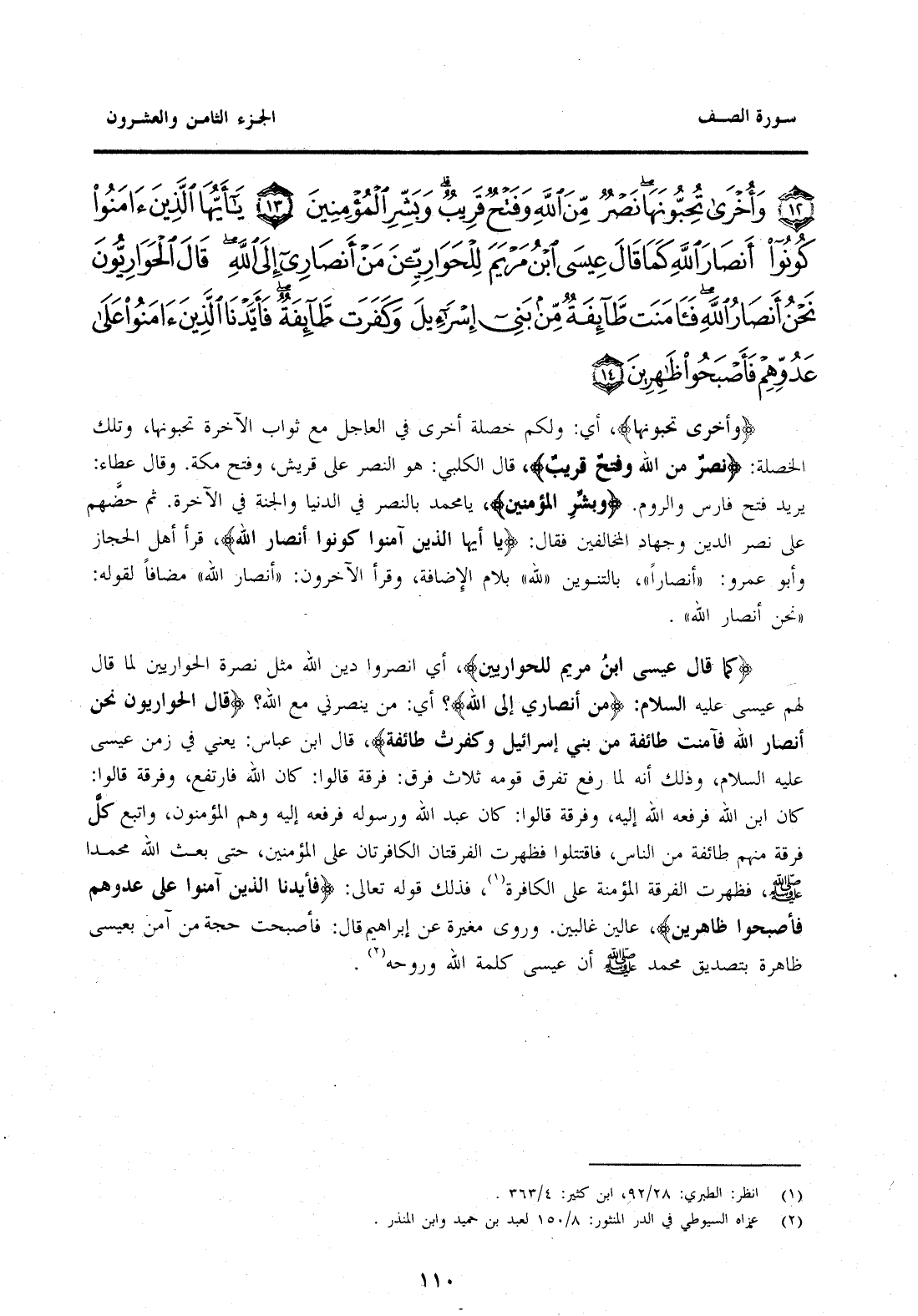 {وَأُخْرَى تُحِبُّونَهَا نَصْرٌ مِنَ اللَّهِ وَفَتْحٌ قَرِيبٌ وَبَشِّرِ الْمُؤْمِنِينَ (13) يَا أَيُّهَا الَّذِينَ آمَنُوا كُونُوا أَنْصَارَ اللَّهِ كَمَا قَالَ عِيسَى ابْنُ مَرْيَمَ لِلْحَوَارِيِّينَ مَنْ أَنْصَارِي إِلَى اللَّهِ قَالَ الْحَوَارِيُّونَ نَحْنُ أَنْصَارُ اللَّهِ فَآمَنَتْ طَائِفَةٌ مِنْ بَنِي إِسْرَائِيلَ وَكَفَرَتْ طَائِفَةٌ فَأَيَّدْنَا الَّذِينَ آمَنُوا عَلَى عَدُوِّهِمْ فَأَصْبَحُوا ظَاهِرِينَ (14) } {وَأُخْرَى تُحِبُّونَهَا} . أَيْ: وَلَكُمْ خَصْلَةٌ أُخْرَى فِي الْعَاجِلِ مَعَ ثَوَابِ الْآخِرَةِ تُحِبُّونَهَا وَتِلْكَ الْخَصْلَةُ: {نَصْرٌ مِنَ اللَّهِ وَفَتْحٌ قَرِيبٌ} . قَالَ الْكَلْبِيُّ: هُوَ النَّصْرُ عَلَى قُرَيْشٍ، وَفَتْحُ مَكَّةَ. وَقَالَ عَطَاءٌ: يُرِيدُ فَتْحَ فَارِسَ وَالرُّومِ. {وَبَشِّرِ الْمُؤْمِنِينَ} . يَا مُحَمَّدُ بِالنَّصْرِ فِي الدُّنْيَا وَالْجَنَّةِ فِي الْآخِرَةِ. ثُمَّ حَضَّهُمْ عَلَى نَصْرِ الدِّينِ وَجِهَادِ الْمُخَالِفِينَ فَقَالَ: {يَا أَيُّهَا الَّذِينَ آمَنُوا كُونُوا أَنْصَارَ اللَّهِ} . قَرَأَ أَهْلُ الْحِجَازِ وَأَبُو عَمْرٍو: "أَنْصَارًا" بِالتَّنْوِينِ "لِلَّهِ" بِلَامِ الْإِضَافَةِ، وَقَرَأَ الْآخَرُونَ: "أَنْصَارَ اللَّهِ" مُضَافًا لِقَوْلِهِ: "نَحْنُ أَنْصَارُ اللَّهِ".