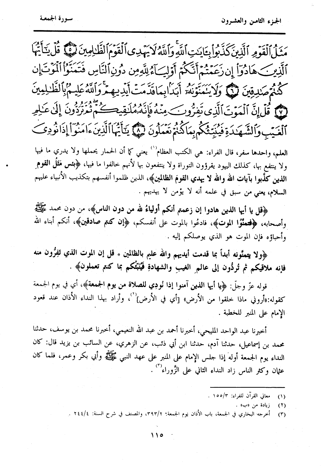 {قُلْ يَا أَيُّهَا الَّذِينَ هَادُوا إِنْ زَعَمْتُمْ أَنَّكُمْ أَوْلِيَاءُ لِلَّهِ مِنْ دُونِ النَّاسِ} مِنْ دُونِ مُحَمَّدٍ صَلَّى اللَّهُ عَلَيْهِ وَسَلَّمَ وَأَصْحَابِهِ {فَتَمَنَّوُا الْمَوْتَ} فَادْعُوا بِالْمَوْتِ عَلَى أَنْفُسِكُمْ {إِنْ كُنْتُمْ صَادِقِينَ} ، أَنَّكُمْ أَبْنَاءُ اللَّهِ وَأَحِبَّاؤُهُ فَإِنَّ الْمَوْتَ هُوَ الَّذِي يُوصِلُكُمْ إِلَيْهِ. {وَلَا يَتَمَنَّوْنَهُ أَبَدًا بِمَا قَدَّمَتْ أَيْدِيهِمْ وَاللَّهُ عَلِيمٌ بِالظَّالِمِينَ قُلْ إِنَّ الْمَوْتَ الَّذِي تَفِرُّونَ مِنْهُ فَإِنَّهُ مُلَاقِيكُمْ ثُمَّ تُرَدُّونَ إِلَى عَالِمِ الْغَيْبِ وَالشَّهَادَةِ فَيُنَبِّئُكُمْ بِمَا كُنْتُمْ تَعْمَلُونَ} قَوْلُهُ عَزَّ وَجَلَّ: {يَا أَيُّهَا الَّذِينَ آمَنُوا إِذَا نُودِيَ لِلصَّلَاةِ مِنْ يَوْمِ الْجُمُعَةِ} أَيْ فِي يَوْمِ الْجُمُعَةِ كَقَوْلِهِ: "أَرَوْنِي مَاذَا خَلَقُوا مِنَ الْأَرْضِ أَيْ فِي الْأَرْضِ" [أَيْ فِي الْأَرْضِ] (1) وَأَرَادَ بِهَذَا النِّدَاءِ الْأَذَانَ عِنْدَ قُعُودِ الْإِمَامِ عَلَى الْمِنْبَرِ لِلْخُطْبَةِ.