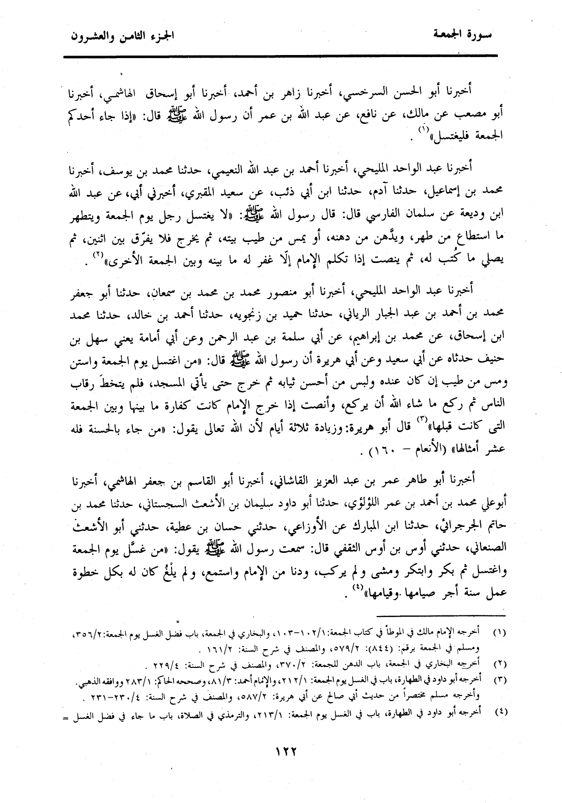 (4) أخرجه أبو داود في الطهارة، باب في الغسل يوم الجمعة: 1 / 213، والترمذي في الصلاة، باب ما جاء في فضل الغسل يوم الجمعة: 3 / 3 - 4 وقال: "حديث أوس بن أوس حديث حسن وأبو الأشعث الصنعاني اسمه شراحيل بن آدة"، والنسائي في الجمعة، باب فضل المشي إلى الجمعة: 3 / 97، وابن ماجه في الإقامة، باب ما جاء في الغسل يوم الجمعة برقم (1087) : 1 / 346، والإمام أحمد: 4 / 104، والمصنف في شرح السنة: 4 / 236.
