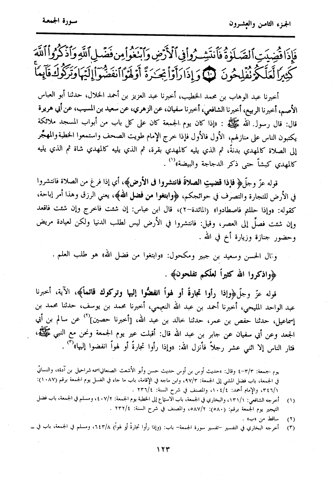 {وَاذْكُرُوا اللَّهَ كَثِيرًا لَعَلَّكُمْ تُفْلِحُونَ} قَوْلُهُ عَزَّ وَجَلَّ {وَإِذَا رَأَوْا تِجَارَةً أَوْ لَهْوًا انْفَضُّوا إِلَيْهَا وَتَرَكُوكَ قَائِمًا} الْآيَةَ، أَخْبَرَنَا عَبْدُ الْوَاحِدِ الْمَلِيحِيُّ، أَخْبَرَنَا أَحْمَدُ بْنُ عَبْدِ اللَّهِ النَّعِيمِيُّ، أَخْبَرَنَا مُحَمَّدُ بْنُ يُوسُفَ، حَدَّثَنَا مُحَمَّدُ بْنُ إِسْمَاعِيلَ، حَدَّثَنَا حَفْصُ بْنُ عُمَرَ، حَدَّثَنَا خَالِدُ بْنُ عَبْدِ اللَّهِ [أَخْبَرَنَا حُصَيْنٌ] (2) عَنْ سَالِمِ بْنِ أَبِي الْجَعْدِ وَعَنْ أَبِي سُفْيَانَ عَنْ جَابِرِ بْنِ عَبْدِ اللَّهِ قَالَ: أَقْبَلَتْ عِيرٌ يَوْمَ الْجُمُعَةِ وَنَحْنُ مَعَ النَّبِيِّ صَلَّى اللَّهُ عَلَيْهِ وَسَلَّمَ فَثَارَ النَّاسُ إِلَّا اثْنَيْ عَشَرَ رَجُلًا فَأَنْزَلَ اللَّهُ: "وَإِذَا رَأَوْا تِجَارَةً أَوْ لَهْوًا انْفَضُّوا إِلَيْهَا" (3) .