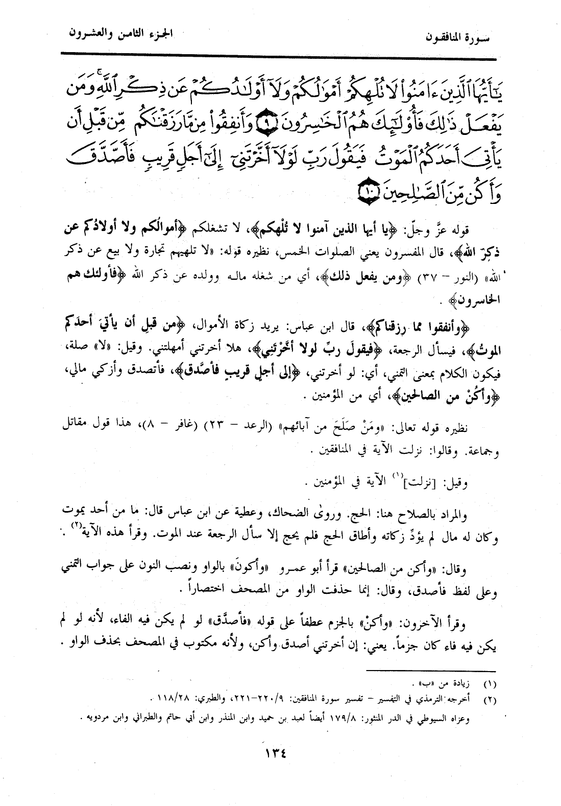 {يَا أَيُّهَا الَّذِينَ آمَنُوا لَا تُلْهِكُمْ أَمْوَالُكُمْ وَلَا أَوْلَادُكُمْ عَنْ ذِكْرِ اللَّهِ وَمَنْ يَفْعَلْ ذَلِكَ فَأُولَئِكَ هُمُ الْخَاسِرُونَ (9) وَأَنْفِقُوا مِنْ مَا رَزَقْنَاكُمْ مِنْ قَبْلِ أَنْ يَأْتِيَ أَحَدَكُمُ الْمَوْتُ فَيَقُولَ رَبِّ لَوْلَا أَخَّرْتَنِي إِلَى أَجَلٍ قَرِيبٍ فَأَصَّدَّقَ وَأَكُنْ مِنَ الصَّالِحِينَ (10) }