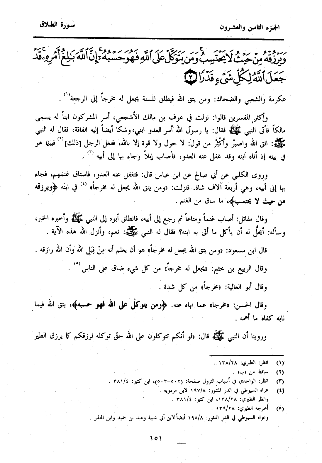 قَالَ ابْنُ مَسْعُودٌ: "وَمَنْ يَتَّقِ اللَّهَ يَجْعَلْ لَهُ مَخْرَجًا" هُوَ أَنْ يَعْلَمَ أَنَّهُ مِنْ قِبَلِ اللَّهِ وَأَنَّ اللَّهُ رَازِقُهُ.