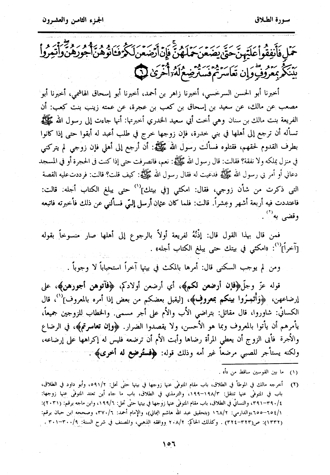 أَخْبَرَنَا أَبُو الْحَسَنِ السَّرَخْسِيُّ أَخْبَرَنَا زَاهِرُ بْنُ أَحْمَدَ أَخْبَرَنَا أَبُو إِسْحَاقَ الْهَاشِمِيُّ أَخْبَرَنَا أَبُو مُصْعَبٍ عَنْ مَالِكٍ، عَنْ سَعِيدِ بْنِ إِسْحَاقَ بْنِ كَعْبِ بْنِ عُجْرَةَ، عَنْ عَمَّتِهِ زَيْنَبَ بِنْتِ كَعْبٍ: أَنَّ الْفُرَيْعَةَ بِنْتَ مَالِكِ بْنِ سِنَانٍ وَهِيَ أُخْتُ أَبِي سَعِيدٍ الْخُدْرِيِّ أَخْبَرَتْهَا: أَنَّهَا جَاءَتْ إِلَى رَسُولِ اللَّهِ صَلَّى اللَّهُ عَلَيْهِ وَسَلَّمَ تَسْأَلُهُ أَنْ تَرْجِعَ إِلَى أَهْلِهَا فِي بَنِي خُدْرَةَ، فَإِنَّ زَوْجَهَا خَرَجَ فِي طَلَبِ أَعْبُدٍ لَهُ أَبَقُوا حَتَّى إِذَا كَانَ بِطَرَفِ الْقَدُومِ لِحِقَهُمْ، فَقَتَلُوهُ فَسَأَلْتُ رَسُولَ اللَّهِ صَلَّى اللَّهُ عَلَيْهِ وَسَلَّمَ: أَنْ أَرْجِعَ إِلَى أَهْلِي فَإِنَّ زَوْجِي لَمْ يَتْرُكْنِي فِي مَنْزِلٍ يَمْلِكُهُ وَلَا نَفَقَةٍ؟ فَقَالَتْ: قَالَ رَسُولُ اللَّهِ صَلَّى اللَّهُ عَلَيْهِ وَسَلَّمَ: نَعَمْ، فَانْصَرَفْتُ حَتَّى إِذَا كُنْتُ فِي الْحُجْرَةِ أَوْ فِي الْمَسْجِدِ دَعَانِي أَوْ أَمَرَ بِي رَسُولُ اللَّهِ صَلَّى اللَّهُ عَلَيْهِ وَسَلَّمَ فَدُعِيتُ لَهُ فَقَالَ رَسُولُ اللَّهِ صَلَّى اللَّهُ عَلَيْهِ وَسَلَّمَ: كَيْفَ قُلْتِ؟ قَالَتْ: فَرَدَدْتُ عَلَيْهِ الْقِصَّةَ الَّتِي ذَكَرْتُ مِنْ شَأْنِ زَوْجِي، فَقَالَ: امْكُثِي [فِي بَيْتِكِ] (1) حَتَّى يَبْلُغَ الْكِتَابُ أَجْلَهُ. قَالَتْ: فَاعْتَدَدْتُ فِيهِ أَرْبَعَةَ أَشْهُرٍ وَعَشْرًا. قَالَتْ: فَلَمَّا كَانَ عُثْمَانُ أَرْسَلَ إِلَيَّ فَسَأَلَنِي عَنْ ذَلِكَ فَأَخْبَرْتُهُ فَاتَّبَعَهُ وَقَضَى بِهِ (2) .