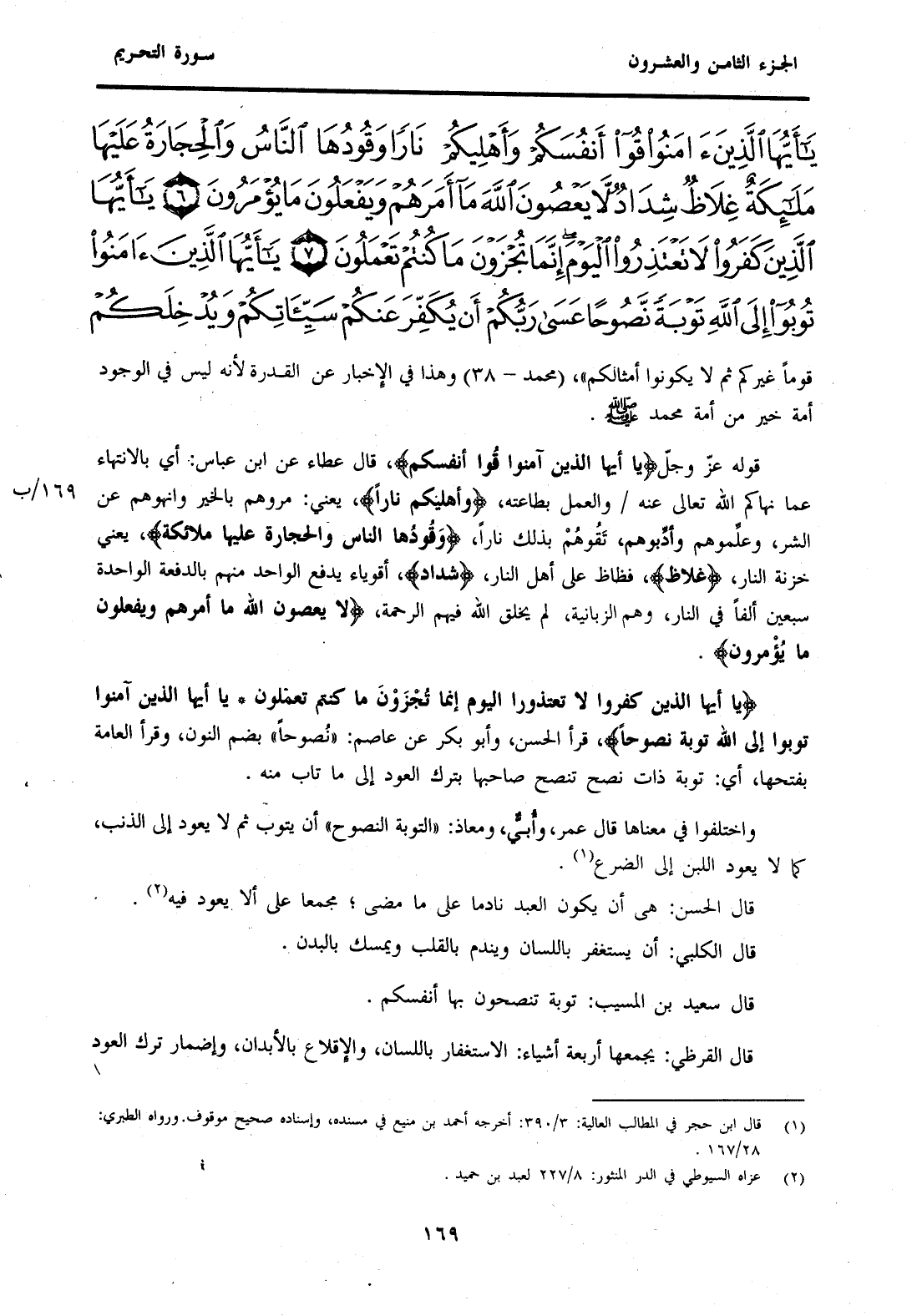 قَوْلُهُ عَزَّ وَجَلَّ {يَا أَيُّهَا الَّذِينَ آمَنُوا قُوا أَنْفُسَكُمْ} قَالَ عَطَاءٌ عَنِ ابْنِ عَبَّاسٍ: أَيْ بِالِانْتِهَاءِ عَمَّا نَهَاكُمُ اللَّهُ تعالى عنه 169/ب وَالْعَمَلِ بِطَاعَتِهِ {وَأَهْلِيكُمْ نَارًا} يَعْنِي: مُرُوهُمْ بِالْخَيْرِ وَانْهُوهُمْ عَنِ الشَّرِّ وَعَلِّمُوهُمْ وَأَدِّبُوهُمْ تَقُوهُمْ بِذَلِكَ نَارًا {وَقُودُهَا النَّاسُ وَالْحِجَارَةُ عَلَيْهَا مَلَائِكَةٌ} يَعْنِي خَزَنَةَ النَّارِ {غِلَاظٌ} فِظَاظٌ عَلَى أَهْلِ النَّارِ {شِدَادٌ} أَقْوِيَاءُ يَدْفَعُ الْوَاحِدُ مِنْهُمْ بِالدَّفْعَةِ الْوَاحِدَةِ سَبْعِينَ أَلْفًا فِي النَّارِ وَهُمُ الزَّبَانِيَةُ، لَمْ يَخْلُقِ اللَّهُ فِيهِمُ الرَّحْمَةَ {لَا يَعْصُونَ اللَّهَ مَا أَمَرَهُمْ وَيَفْعَلُونَ مَا يُؤْمَرُونَ يَا أَيُّهَا الَّذِينَ كَفَرُوا لَا تَعْتَذِرُوا الْيَوْمَ إِنَّمَا تُجْزَوْنَ مَا كُنْتُمْ تَعْمَلُونَ} {يَا أَيُّهَا الَّذِينَ آمَنُوا تُوبُوا إِلَى اللَّهِ تَوْبَةً نَصُوحًا} قَرَأَ الْحَسَنُ وَأَبُو بَكْرٍ عَنْ عَاصِمٍ: "نُصُوحًا" بِضَمِّ النُّونِ، وَقَرَأَ الْعَامَّةُ بِفَتْحِهَا أَيْ: تَوْبَةً ذَاتَ نُصْحٍ تَنْصَحُ صَاحِبَهَا بِتَرْكِ الْعَوْدِ إِلَى مَا تَابَ مِنْهُ.