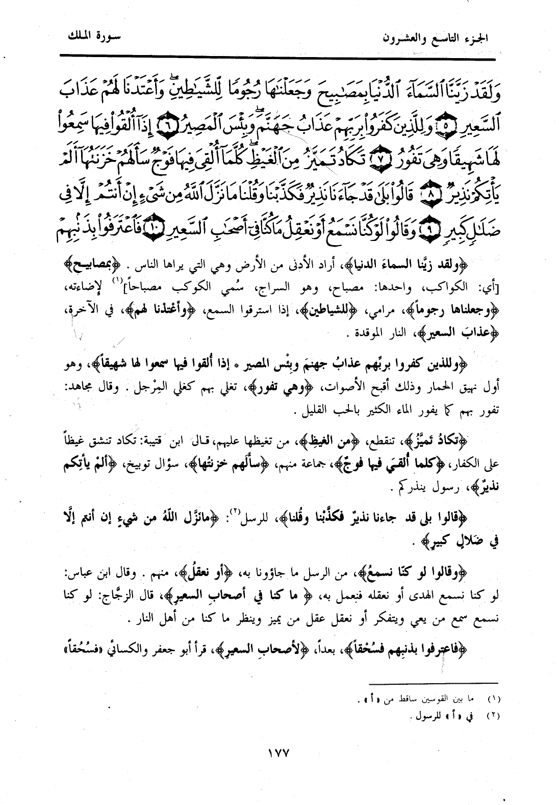 {وَلَقَدْ زَيَّنَّا السَّمَاءَ الدُّنْيَا} أَرَادَ الْأَدْنَى مِنَ الْأَرْضِ وَهِيَ الَّتِي يَرَاهَا النَّاسُ. {بِمَصَابِيحَ} [أَيِ: الْكَوَاكِبَ وَاحِدُهَا: مِصْبَاحٌ وَهُوَ السِّرَاجُ سُمِّيَ الْكَوْكَبُ مِصْبَاحًا] (1) لِإِضَاءَتِهِ {وَجَعَلْنَاهَا رُجُومًا} مَرَامِيَ {لِلشَّيَاطِينِ} إِذَا اسْتَرَقُوا السَّمْعَ {وَأَعْتَدْنَا لَهُمْ} فِي الْآخِرَةِ {عَذَابَ السَّعِيرِ} النَّارَ الْمُوقَدَةَ. {وَلِلَّذِينَ كَفَرُوا بِرَبِّهِمْ عَذَابُ جَهَنَّمَ وَبِئْسَ الْمَصِيرُ إِذَا أُلْقُوا فِيهَا سَمِعُوا لَهَا شَهِيقًا} وَهُوَ أَوَّلُ نَهِيقِ الْحِمَارِ وَذَلِكَ أَقْبَحُ الْأَصْوَاتِ {وَهِيَ تَفُورُ} تَغْلِي بِهِمْ كَغَلْيِ الْمِرْجَلِ. وَقَالَ مُجَاهِدٌ: تَفُورُ بِهِمْ كَمَا يَفُورُ الْمَاءُ الْكَثِيرُ بِالْحَبِّ الْقَلِيلِ.