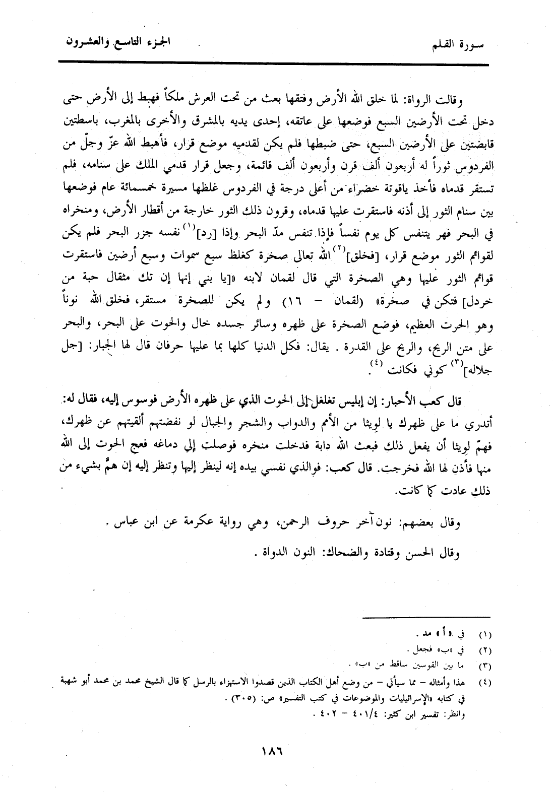 وَقَالَتِ الرُّوَاةُ: لَمَّا خَلَقَ اللَّهُ الْأَرْضَ وَفَتْقَهَا بَعَثَ مِنْ تَحْتِ الْعَرْشِ مَلَكًا فَهَبَطَ إِلَى الْأَرْضِ حَتَّى دَخَلَ تَحْتَ الْأَرْضِينَ السَّبْعَ فَوَضَعَهَا عَلَى عَاتِقِهِ، إِحْدَى يَدَيْهِ بِالْمُشْرِقِ وَالْأُخْرَى بِالْمَغْرِبِ، بَاسِطَتَيْنِ قَابِضَتَيْنِ عَلَى الْأَرْضِينَ السَّبْعَ، حَتَّى ضَبَطَهَا فَلَمْ يَكُنْ لِقَدَمَيْهِ مَوْضِعُ قَرَارٍ، فَأَهْبَطَ اللَّهُ عَزَّ وَجَلَّ مِنَ الْفِرْدَوْسِ ثَوْرًا لَهُ أَرْبَعُونَ أَلْفَ قَرْنٍ وَأَرْبَعُونَ أَلْفَ قَائِمَةٍ، وَجُعِلَ قَرَارُ قَدَمَيِ الْمَلِكِ عَلَى سَنَامِهِ، فَلَمْ تَسْتَقِرَّ قَدَمَاهُ فَأَخَذَ اللَّهُ يَاقُوتَةً خَضْرَاءَ مِنْ أَعْلَى دَرَجَةٍ فِي الْفِرْدَوْسِ غِلَظُهَا مَسِيرَةُ خَمْسمِائَةِ عَامٍ فَوَضَعَهَا بَيْنَ سَنَامِ الثَّوْرِ إِلَى أُذُنِهِ فَاسْتَقَرَّتْ عَلَيْهَا قَدَمَاهُ، وَقُرُونُ ذَلِكَ الثَّوْرِ خَارِجَةُ مِنْ أَقْطَارِ الْأَرْضِ، وَمَنْخِرَاهُ فِي الْبَحْرِ فَهُوَ يَتَنَفَّسُ كُلَّ يَوْمٍ نَفَسًا فَإِذَا تَنَفَّسَ مَدَّ الْبَحْرُ وَإِذَا [رَدَّ] (1) نَفَسَهُ جَزَرَ الْبَحْرُ فَلَمْ يَكُنْ لِقَوَائِمِ الثَّوْرِ مَوْضِعَ قَرَارٍ [فَخَلَقَ] (2) اللَّهُ تَعَالَى صَخْرَةً كَغِلَظِ سَبْعِ سَمَاوَاتٍ وَسَبْعِ أَرْضِينَ فَاسْتَقَرَّتْ قَوَائِمُ الثَّوْرِ عَلَيْهَا وَهِيَ الصَّخْرَةُ الَّتِي قَالَ لُقْمَانُ لِابْنِهِ " [يَا بُنَيَّ إِنَّهَا إِنْ تَكُ مِثْقَالَ حَبَّةٍ مِنْ خَرْدَلٍ] فَتَكُنْ فِي صَخْرَةٍ" وَلَمْ يَكُنْ لِلصَّخْرَةِ مُسْتَقَرٌّ، فَخَلَقَ اللَّهُ نُونًا وَهُوَ الْحُوتُ الْعَظِيمُ، فَوَضْعَ الصَّخْرَةَ عَلَى ظَهْرِهِ وَسَائِرُ جَسَدِهِ خَالٍ وَالْحُوتُ عَلَى الْبَحْرِ، وَالْبَحْرُ عَلَى مَتْنِ الرِّيحِ، وَالرِّيحُ عَلَى الْقُدْرَةِ. يُقَالُ: فَكُلُّ الدُّنْيَا كُلُّهَا بِمَا عَلَيْهَا حَرْفَانِ قَالَ لَهَا الْجَبَّارُ: [جَلَّ جَلَالُهُ] (3) كَوْنِي فَكَانَتْ (4) .