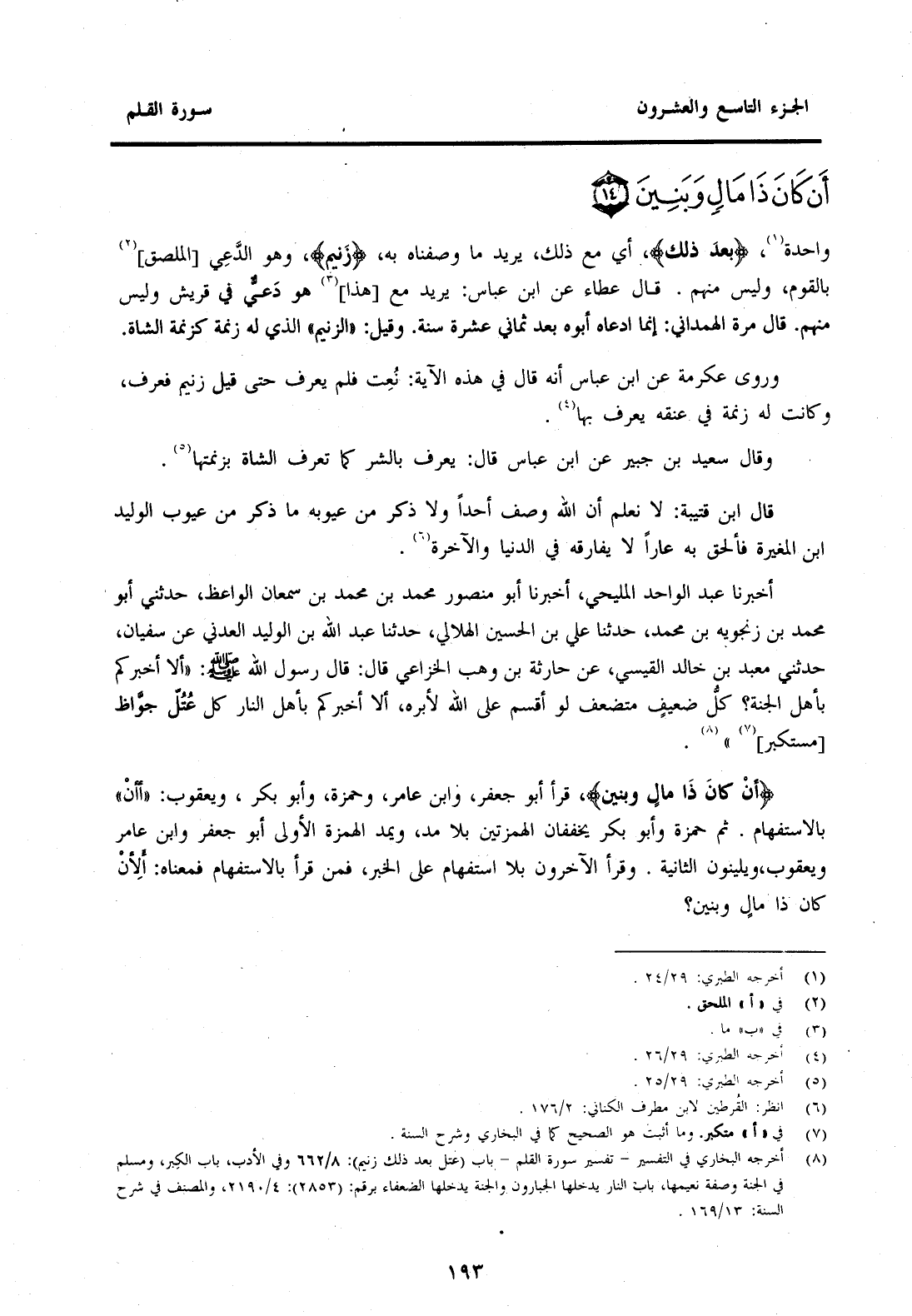 {أَنْ كَانَ ذَا مَالٍ وَبَنِينَ} قَرَأَ أَبُو جَعْفَرٍ وَابْنُ عَامِرٍ وَحَمْزَةُ وَأَبُو بَكْرٍ وَيَعْقُوبُ: "أَإِنْ" بِالِاسْتِفْهَامِ. ثُمَّ حَمْزَةُ وَأَبُو بَكْرٍ يُخَفِّفَانِ الْهَمْزَتَيْنِ بِلَا مَدٍّ وَيَمُدُّ الْهَمْزَةَ الْأُولَى أَبُو جَعْفَرٍ وَابْنُ عَامِرٍ وَيَعْقُوبُ وَيُلَيْنُونَ الثَّانِيَةَ. وَقَرَأَ الْآخَرُونَ بِلَا اسْتِفْهَامٍ عَلَى الْخَبَرِ، فَمَنْ قَرَأَ بِالِاسْتِفْهَامِ فَمَعْنَاهُ: أَلَإِنْ كَانَ ذَا مَالٍ وَبَنِينَ؟