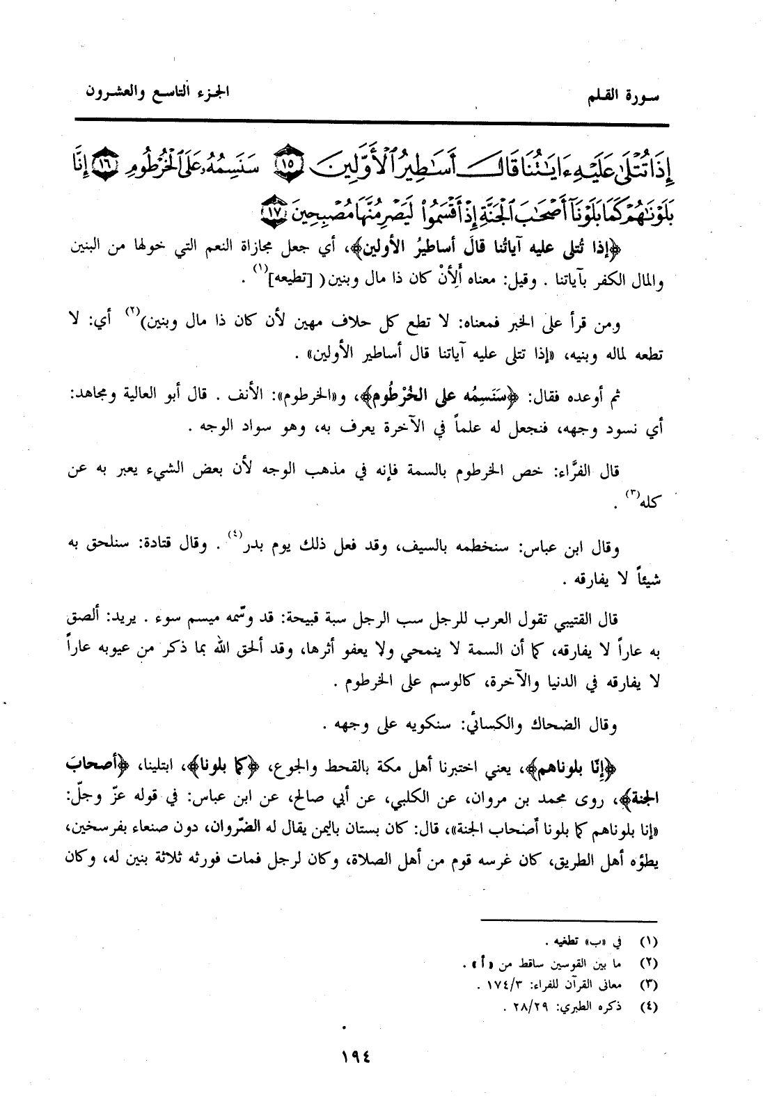 {سَنَسِمُهُ عَلَى الْخُرْطُومِ (16) إِنَّا بَلَوْنَاهُمْ كَمَا بَلَوْنَا أَصْحَابَ الْجَنَّةِ إِذْ أَقْسَمُوا لَيَصْرِمُنَّهَا مُصْبِحِينَ (17) }