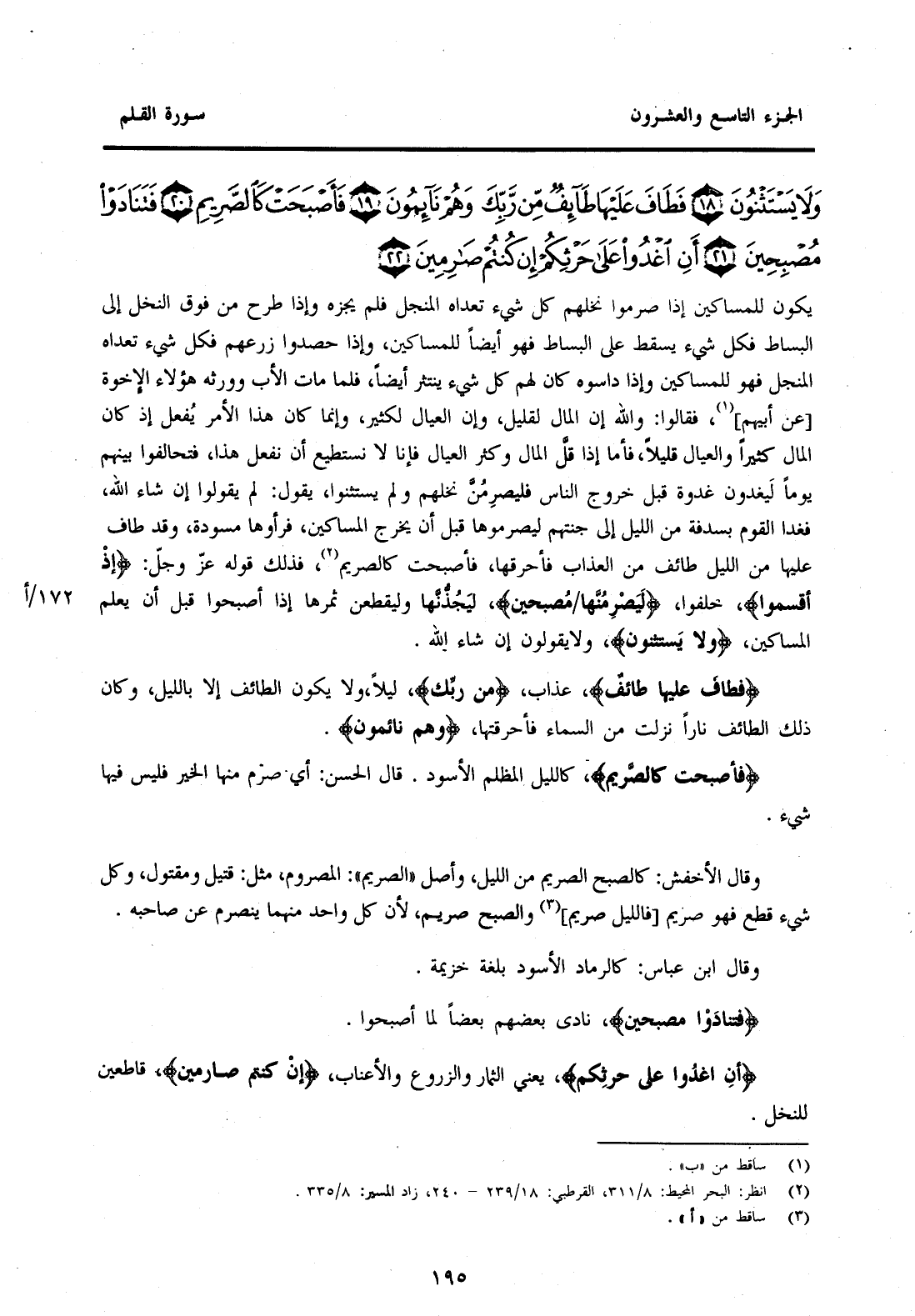 يَكُونُ لِلْمَسَاكِينِ إِذَا صَرَمُوا نَخْلَهُمْ كُلُّ شَيْءٍ تَعَدَّاهُ الْمِنْجَلُ فَلَمْ يَجُزَّهُ وَإِذَا طَرَحَ مِنْ فَوْقِ النَّخْلِ إِلَى الْبِسَاطِ فَكُلُّ شَيْءٍ يَسْقُطُ عَلَى الْبِسَاطِ فَهُوَ أَيْضًا لِلْمَسَاكِينِ، وَإِذَا حَصَدُوا زَرْعَهُمْ فَكُلُّ شَيْءٍ تَعَدَّاهُ الْمِنْجَلُ فَهُوَ لِلْمَسَاكِينِ وَإِذَا دَاسُوهُ كَانَ لَهُمْ كُلُّ شَيْءٍ يَنْتَثِرُ أَيْضًا فَلَمَّا مَاتَ الْأَبُ وَوَرِثَهُ هَؤُلَاءِ الْإِخْوَةُ [عَنْ أَبِيهِمْ] (1) فَقَالُوا: وَاللَّهِ إِنَّ الْمَالَ لَقَلِيلٌ، وَإِنَّ الْعَيَّالَ لَكَثِيرٌ وَإِنَّمَا كَانَ هَذَا الْأَمْرُ يُفْعَلُ إِذْ كَانَ الْمَالُ كَثِيرًا وَالْعِيَالُ قَلِيلًا فَأَمَّا إِذَا قَلَّ الْمَالُ وَكَثُرَ الْعِيَالُ فَإِنَّا لَا نَسْتَطِيعُ أَنْ نَفْعَلَ هَذَا فَتَحَالَفُوا بَيْنَهُمْ يَوْمًا لَيَغْدُوُنَّ غَدْوَةً قَبْلَ خُرُوجِ النَّاسِ فَلْيَصْرِمُنَّ نَخْلَهُمْ وَلَمْ يَسْتَثْنُوا يَقُولُ: لَمْ يَقُولُوا إِنْ شَاءَ اللَّهُ فَغَدَا الْقَوْمُ بِسُدْفَةٍ مِنَ اللَّيْلِ إِلَى جَنَّتِهِمْ لِيَصْرِمُوهَا قَبْلَ أَنْ يَخْرُجَ الْمَسَاكِينُ، فَرَأَوْهَا مُسَوَّدَةً وَقَدْ طَافَ عَلَيْهَا مِنَ اللَّيْلِ طَائِفٌ مِنَ الْعَذَابِ فَأَحْرَقَهَا فَأَصْبَحَتْ كَالصَّرِيمِ (2) فَذَلِكَ قَوْلُهُ عَزَّ وَجَلَّ: {إِذْ أَقْسَمُوا} حَلَفُوا {لَيَصْرِمُنَّهَا مُصْبِحِينَ} 172/ألَيَجُذُّنَّهَا وَلَيَقْطَعُنَّ ثَمَرَهَا إِذَا أَصْبَحُوا قَبْلَ أَنْ يَعْلَمَ الْمَسَاكِينُ