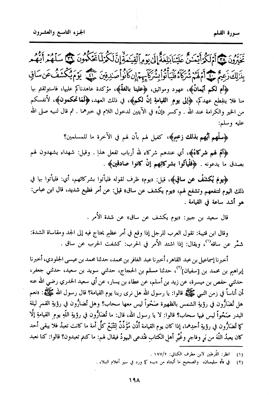 {يَوْمَ يُكْشَفُ عَنْ سَاقٍ} قِيلَ: "يَوْمَ" ظَرْفٌ لِقَوْلِهِ فَلْيَأْتُوا بِشُرَكَائِهِمْ، أَيْ: فَلْيَأْتُوا بِهَا فِي ذَلِكَ الْيَوْمِ لِتَنْفَعَهُمْ وَتَشْفَعَ لَهُمْ "يَوْمَ يُكْشَفُ عَنْ سَاقٍ" قِيلَ: عَنْ أَمْرٍ فَظِيعٍ شَدِيدٍ، قَالَ ابْنُ عَبَّاسٍ: هُوَ أَشَدُّ سَاعَةٍ فِي الْقِيَامَةِ.