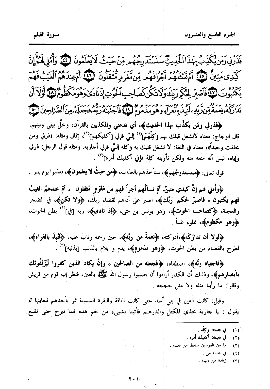 {فَذَرْنِي وَمَنْ يُكَذِّبُ بِهَذَا الْحَدِيثِ سَنَسْتَدْرِجُهُمْ مِنْ حَيْثُ لَا يَعْلَمُونَ (44) وَأُمْلِي لَهُمْ إِنَّ كَيْدِي مَتِينٌ (45) أَمْ تَسْأَلُهُمْ أَجْرًا فَهُمْ مِنْ مَغْرَمٍ مُثْقَلُونَ (46) أَمْ عِنْدَهُمُ الْغَيْبُ فَهُمْ يَكْتُبُونَ (47) فَاصْبِرْ لِحُكْمِ رَبِّكَ وَلَا تَكُنْ كَصَاحِبِ الْحُوتِ إِذْ نَادَى وَهُوَ مَكْظُومٌ (48) لَوْلَا أَنْ تَدَارَكَهُ نِعْمَةٌ مِنْ رَبِّهِ لَنُبِذَ بِالْعَرَاءِ وَهُوَ مَذْمُومٌ (49) فَاجْتَبَاهُ رَبُّهُ فَجَعَلَهُ مِنَ الصَّالِحِينَ (50) }