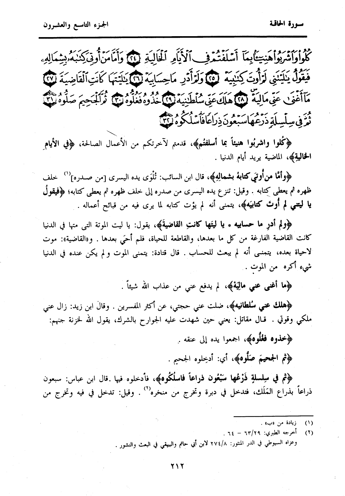 {كُلُوا وَاشْرَبُوا هَنِيئًا بِمَا أَسْلَفْتُمْ فِي الْأَيَّامِ الْخَالِيَةِ (24) وَأَمَّا مَنْ أُوتِيَ كِتَابَهُ بِشِمَالِهِ فَيَقُولُ يَا لَيْتَنِي لَمْ أُوتَ كِتَابِيَهْ (25) وَلَمْ أَدْرِ مَا حِسَابِيَهْ (26) يَا لَيْتَهَا كَانَتِ الْقَاضِيَةَ (27) مَا أَغْنَى عَنِّي مَالِيَهْ (28) هَلَكَ عَنِّي سُلْطَانِيَهْ (29) خُذُوهُ فَغُلُّوهُ (30) ثُمَّ الْجَحِيمَ صَلُّوهُ (31) ثُمَّ فِي سِلْسِلَةٍ ذَرْعُهَا سَبْعُونَ ذِرَاعًا فَاسْلُكُوهُ (32) }