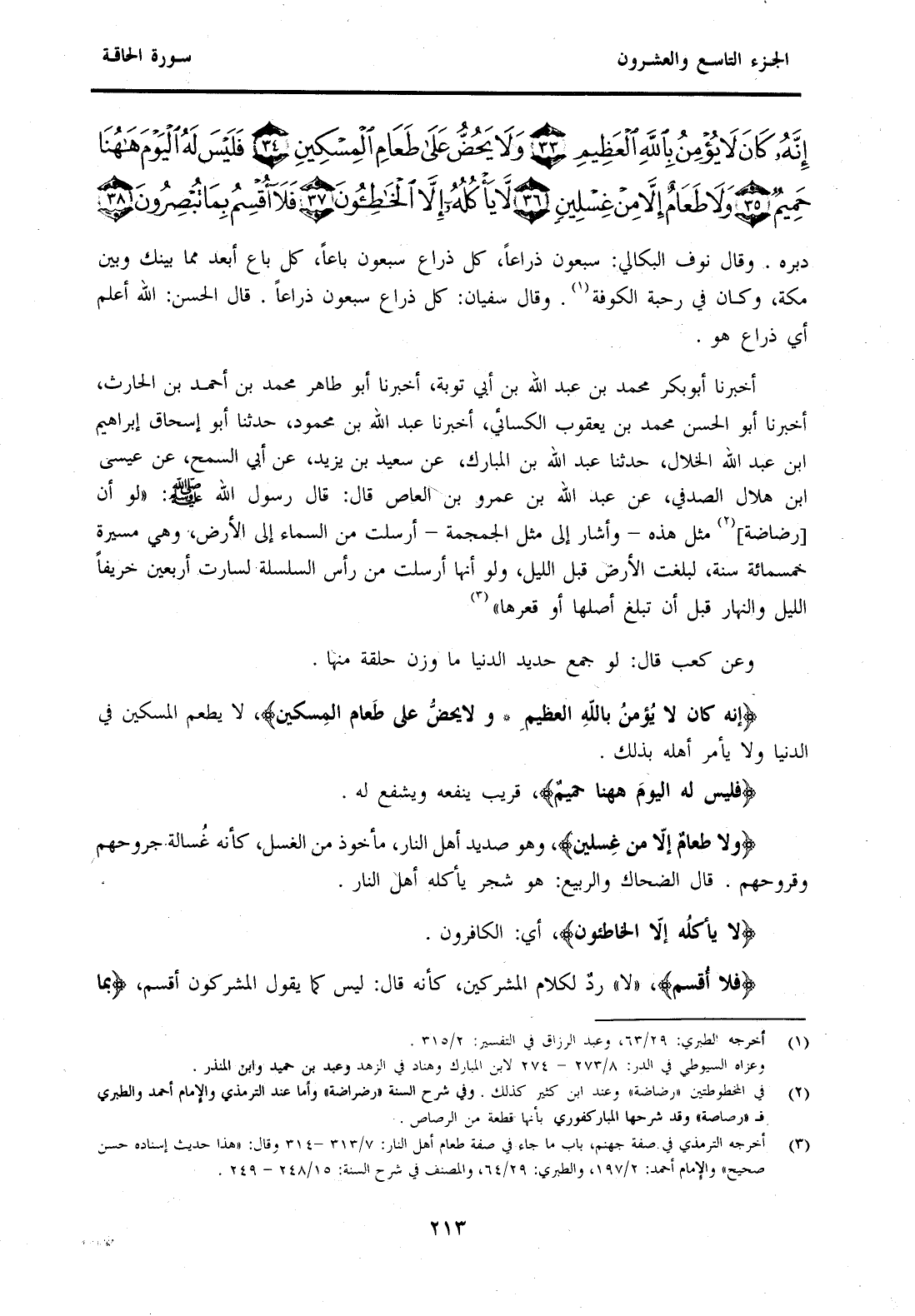 {إِنَّهُ كَانَ لَا يُؤْمِنُ بِاللَّهِ الْعَظِيمِ وَلَا يَحُضُّ عَلَى طَعَامِ الْمِسْكِينِ} لَا يُطْعِمُ الْمِسْكِينَ فِي الدُّنْيَا وَلَا يَأْمُرُ أَهْلَهُ بِذَلِكَ. {فَلَيْسَ لَهُ الْيَوْمَ هَاهُنَا حَمِيمٌ} قَرِيبٌ يَنْفَعُهُ وَيَشْفَعُ لَهُ. {وَلَا طَعَامٌ إِلَّا مِنْ غِسْلِينٍ} وَهُوَ صَدِيدُ أَهْلِ النَّارِ، مَأْخُوذٌ مِنَ الْغَسْلِ، كَأَنَّهُ غُسَالَةُ جُرُوحِهِمْ وَقُرُوحِهِمْ. قَالَ الضَّحَّاكُ وَالرَّبِيعُ: هُوَ شَجَرٌ يَأْكُلُهُ أَهْلُ النَّارِ. {لَا يَأْكُلُهُ إِلَّا الْخَاطِئُونَ} أَيِ: الْكَافِرُونَ. {فَلَا أُقْسِمُ} "لَا" رَدٌّ لِكَلَامِ الْمُشْرِكِينَ، كَأَنَّهُ قَالَ: لَيْسَ كَمَا يَقُولُ الْمُشْرِكُونَ أُقْسِمُ