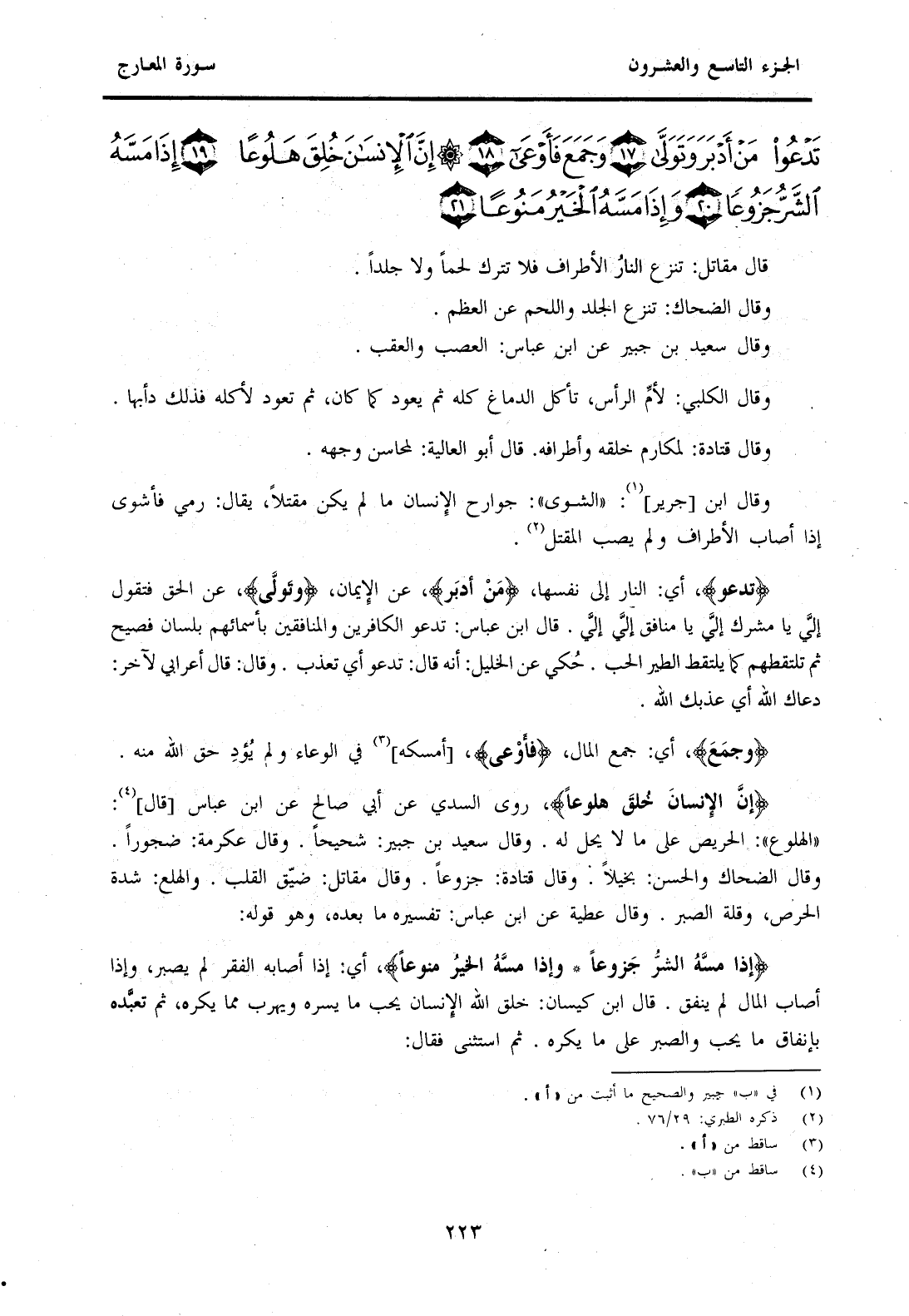 {تَدْعُوا} أَيِ: النَّارُ إِلَى نَفْسِهَا {مَنْ أَدْبَرَ} عَلَى الْإِيمَانِ {وَتَوَلَّى} عَنِ الْحَقِّ فَتَقُولُ إِلَيَّ يَا مُشْرِكُ إِلَيَّ يَا مُنَافِقُ إِلَيَّ إِلَيَّ. قَالَ ابْنُ عَبَّاسٍ: تَدْعُو الْكَافِرِينَ وَالْمُنَافِقِينَ بِأَسْمَائِهِمْ بِلِسَانٍ فَصِيحٍ ثُمَّ تَلْتَقِطُهُمْ كَمَا يَلْتَقِطُ الطَّيْرُ الْحَبَّ. حُكِيَ عَنِ الْخَلِيلِ: أَنَّهُ قَالَ: تَدْعُو أَيْ تُعَذِّبُ. وَقَالَ: قَالَ أَعْرَابِيٌّ لِآخَرَ: دَعَاكَ اللَّهُ أَيْ عَذَّبَكَ اللَّهُ. {وَجَمَعَ} أَيْ: جَمَعَ الْمَالَ {فَأَوْعَى} [أَمْسَكَهُ] (3) فِي الْوِعَاءِ وَلَمْ يُؤَدِّ حَقَّ اللَّهِ مِنْهُ. {إِنَّ الْإِنْسَانَ خُلِقَ هَلُوعًا} رَوَى السُّدِّيُّ عَنْ أَبِي صَالِحٍ عَنِ ابْنِ عَبَّاسٍ [قَالَ] (4) "الْهَلُوعُ" الْحَرِيصُ عَلَى مَا لَا يَحِلُّ لَهُ. وَقَالَ سَعِيدُ بْنُ جُبَيْرٍ: شَحِيحًا. وَقَالَ عِكْرِمَةُ: ضَجُورًا. وَقَالَ الضَّحَّاكُ وَالْحَسَنُ: بَخِيلًا. وَقَالَ قَتَادَةُ: جَزُوعًا. وَقَالَ مُقَاتِلٌ: ضَيِّقَ الْقَلْبِ. وَالْهَلَعُ: شِدَّةُ الْحِرْصِ وَقِلَّةُ الصَّبْرِ. وَقَالَ عَطِيَّةُ عَنِ ابْنِ عَبَّاسٍ: تَفْسِيرُهُ مَا بَعْدَهُ وَهُوَ قَوْلُهُ: {إِذَا مَسَّهُ الشَّرُّ جَزُوعًا وَإِذَا مَسَّهُ الْخَيْرُ مَنُوعًا} أَيْ: إِذَا أَصَابَهُ الْفَقْرُ لَمْ يَصْبِرْ، وَإِذَا أَصَابَ الْمَالَ لَمْ يُنْفِقْ. قَالَ ابْنُ كَيْسَانَ: خَلَقُ اللَّهُ الْإِنْسَانَ يُحِبُّ مَا يَسُرُّهُ وَيَهْرَبُ مِمَّا يَكْرَهُ، ثُمَّ تَعَبَّدَهُ بِإِنْفَاقِ مَا يُحِبُّ وَالصَّبْرِ عَلَى مَا يَكْرَهُ. ثُمَّ اسْتَثْنَى فَقَالَ: