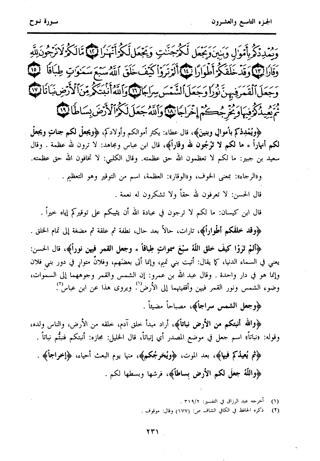قَالَ ابْنُ كَيْسَانَ: مَا لَكَمَ لَا تَرْجُونَ فِي عِبَادَةِ اللَّهِ أَنْ يُثِيبَكُمْ عَلَى تَوْقِيرِكُمْ إِيَّاهُ خَيْرًا. {وَقَدْ خَلَقَكُمْ أَطْوَارًا} تَارَاتٍ حَالًا بَعْدَ حَالٍ نُطْفَةً ثُمَّ عَلَقَةً ثُمَّ مُضْغَةً إِلَى تَمَامِ الْخَلْقِ. {أَلَمْ تَرَوْا كَيْفَ خَلَقَ اللهُ سَبْعَ سَمَوَاتٍ طِبَاقًا وَجَعَلَ الْقَمَرَ فِيهِنَّ نُورًا} قَالَ الْحَسَنُ: يَعْنِي فِي السَّمَاءِ الدُّنْيَا كَمَا يُقَالُ: أَتَيْتُ بَنِي تَمِيمٍ، وَإِنَّمَا أَتَى بَعْضَهُمْ، وَفُلَانٌ مُتَوَارٍ فِي دُورِ بَنِي فُلَانٍ وَإِنَّمَا هُوَ فِي دَارٍ وَاحِدَةٍ. وَقَالَ عَبْدُ اللَّهِ بْنُ عَمْرٍو: إِنَّ الشَّمْسَ وَالْقَمَرَ وُجُوهُهُمَا إِلَى السَّمَاوَاتِ، وَضَوْءُ الشَّمْسِ وَنُورُ الْقَمَرِ فِيهِنَّ وَأَقْفِيَتُهُمَا إِلَى الْأَرْضِ (1) . وَيُرْوَى هَذَا عَنِ ابْنِ عَبَّاسٍ (2) .