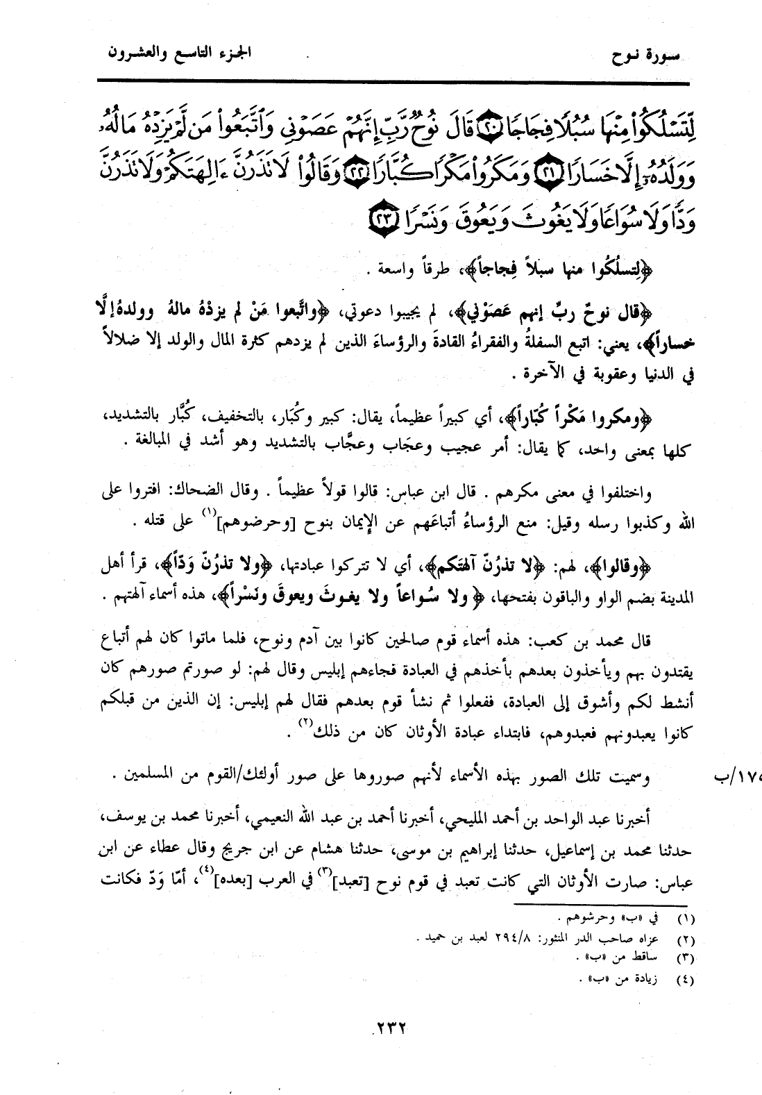 {لِتَسْلُكُوا مِنْهَا سُبُلًا فِجَاجًا (20) قَالَ نُوحٌ رَبِّ إِنَّهُمْ عَصَوْنِي وَاتَّبَعُوا مَنْ لَمْ يَزِدْهُ مَالُهُ وَوَلَدُهُ إِلَّا خَسَارًا (21) وَمَكَرُوا مَكْرًا كُبَّارًا (22) وَقَالُوا لَا تَذَرُنَّ آلِهَتَكُمْ وَلَا تَذَرُنَّ وَدًّا وَلَا سُوَاعًا وَلَا يَغُوثَ وَيَعُوقَ وَنَسْرًا (23) }