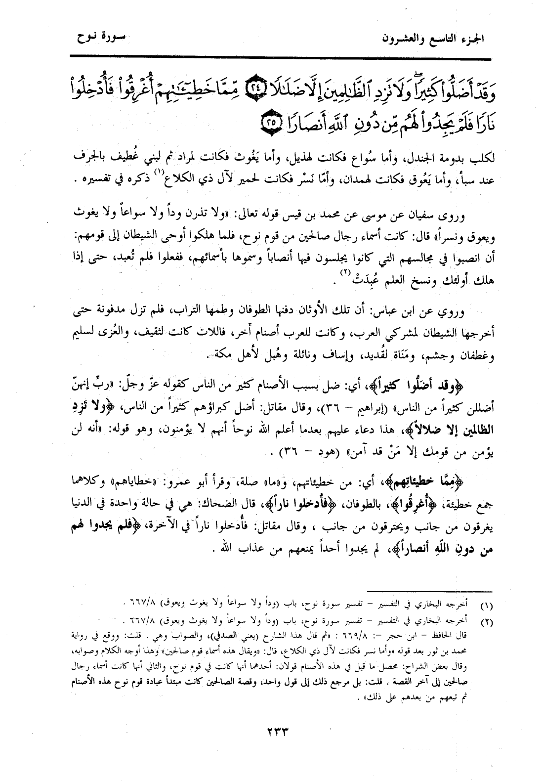 (2) أخرجه البخاري في التفسير - تفسير سورة نوح، باب (ودا ولا سواعا ولا يغوث ويعوق) 8 / 667. قال الحافظ - ابن حجر -: 8 / 669: "ثم قال هذا الشارح (يعني الصدفي) والصواب وهي. قلت: ووقع في رواية محمد بن ثور بعد قوله "وأما نسر فكانت لآل ذي الكلاع، قال: "ويقال هذه أسماء قوم صالحين" وهذا أوجه الكلام وصوابه، وقال بعض الشراح: محصل ما قيل في هذه الأصنام قولان: أحدهما أنها كانت في قوم نوح، والثاني أنها كانت أسماء رجال صالحين إلى آخر القصة. قلت: بل مرجع ذلك إلى قول واحد، وقصة الصالحين كانت مبتدأ عبادة قوم نوح هذه الأصنام ثم تبعهم من بعدهم على ذلك".