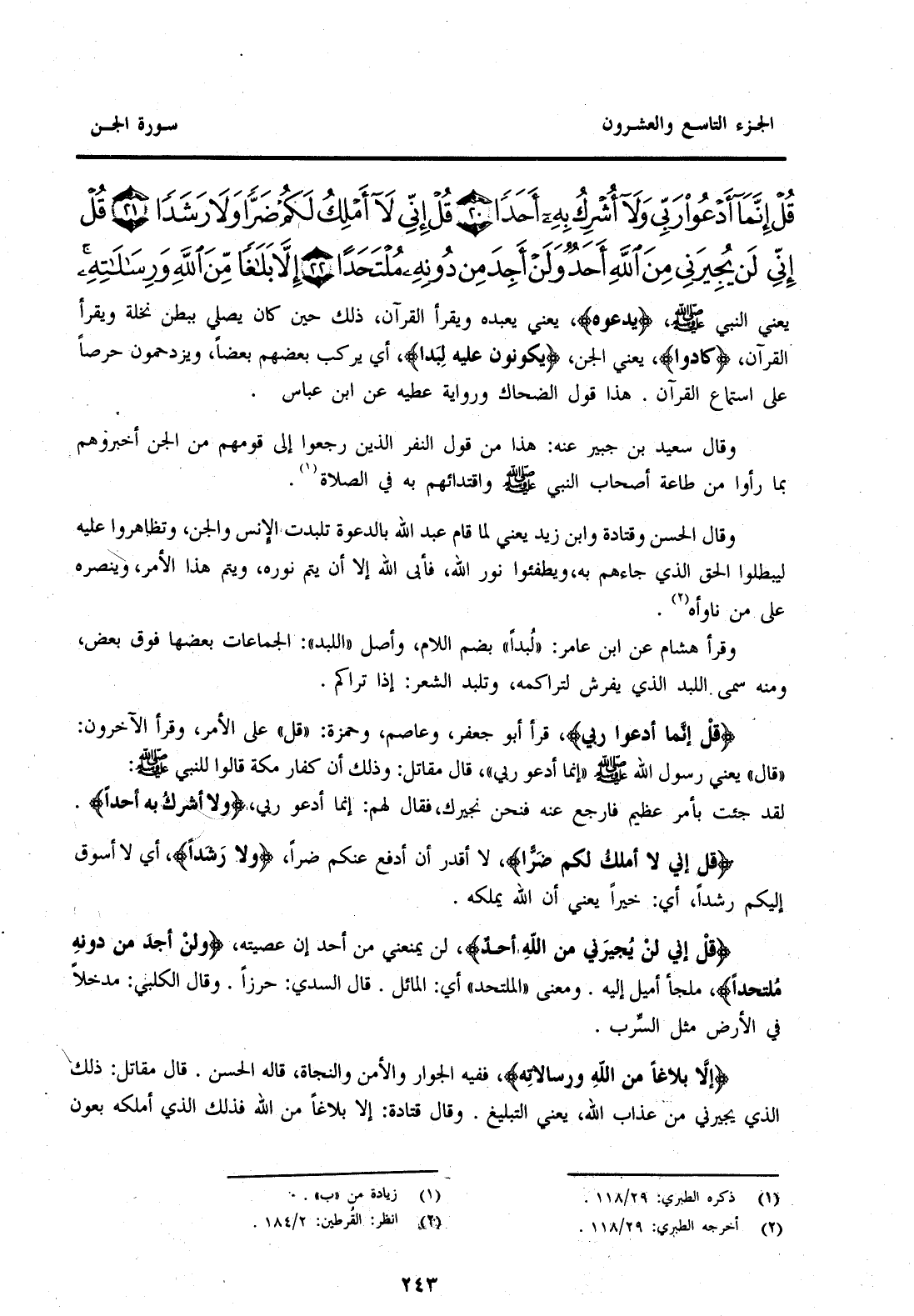 {قُلْ إِنَّمَا أَدْعُو رَبِّي} قَرَأَ أَبُو جَعْفَرٍ وَعَاصِمٌ وَحَمْزَةُ: "قُلْ" عَلَى الْأَمْرِ، وَقَرَأَ الْآخَرُونَ: "قَالَ" يَعْنِي رَسُولَ اللَّهِ صَلَّى اللَّهُ عَلَيْهِ وَسَلَّمَ "إِنَّمَا أَدْعُو رَبِّي" قَالَ مُقَاتِلٌ: وَذَلِكَ أَنَّ كُفَّارَ مَكَّةَ قَالُوا لِلنَّبِيِّ صَلَّى اللَّهُ عَلَيْهِ وَسَلَّمَ: لَقَدْ جِئْتَ بِأَمْرٍ عَظِيمٍ فَارْجِعْ عَنْهُ فَنَحْنُ نُجِيرُكَ، فَقَالَ لَهُمْ: إِنَّمَا أَدْعُو رَبِّي {وَلَا أُشْرِكُ بِهِ أَحَدًا} {قُلْ إِنِّي لَا أَمْلِكُ لَكُمْ ضَرًّا} لَا أَقْدِرُ أَنْ أَدْفَعَ عَنْكُمْ ضَرًا {وَلَا رَشَدًا} أَيْ لَا أَسُوقُ إِلَيْكُمْ رَشَدًا أَيْ: خَيْرًا يَعْنِي أَنَّ اللَّهَ يَمْلِكُهُ. {قُلْ إِنِّي لَنْ يُجِيرَنِي مِنَ اللَّهِ أَحَدٌ} لَنْ يَمْنَعَنِي مِنْ أَحَدٍ إِنْ عَصَيْتُهُ {وَلَنْ أَجِدَ مِنْ دُونِهِ مُلْتَحَدًا} مَلْجَأً أَمِيلُ إِلَيْهِ. وَمَعْنَى "الْمُلْتَحَدِ" أَيِ: الْمَائِلِ. قَالَ السُّدِّيُّ: حِرْزًا. وَقَالَ الْكَلْبِيُّ: مُدْخَلًا فِي الْأَرْضِ مِثْلَ السِّرْبِ. {إِلَّا بَلَاغًا مِنَ اللَّهِ وَرِسَالَاتِهِ} فَفِيهِ الْجِوَارُ وَالْأَمْنُ وَالنَّجَاةُ، قَالَهُ الْحَسَنُ. قَالَ مُقَاتِلٌ: ذَلِكَ الَّذِي يُجِيرُنِي مِنْ عَذَابِ اللَّهِ، يَعْنِي التَّبْلِيغَ. وَقَالَ قَتَادَةُ: إِلَّا بَلَاغًا مِنَ اللَّهِ فَذَلِكَ الَّذِي أَمْلِكُهُ بِعَوْنِ