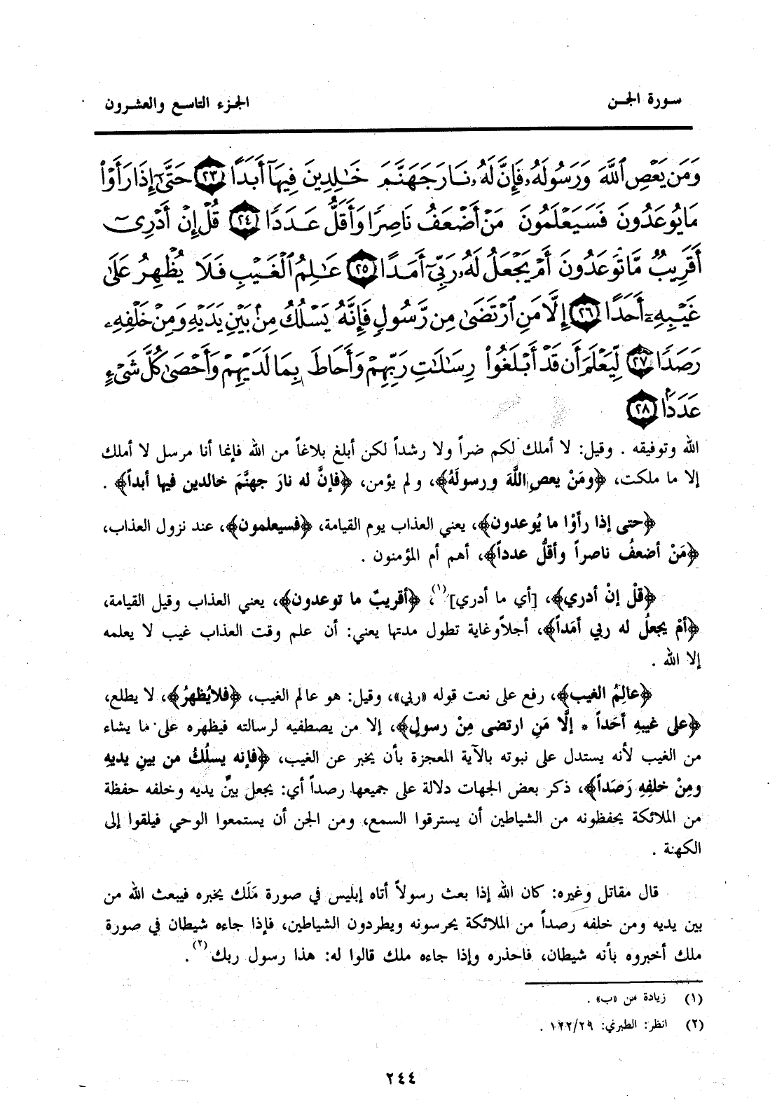 {حَتَّى إِذَا رَأَوْا مَا يُوعَدُونَ فَسَيَعْلَمُونَ مَنْ أَضْعَفُ نَاصِرًا وَأَقَلُّ عَدَدًا (24) قُلْ إِنْ أَدْرِي أَقَرِيبٌ مَا تُوعَدُونَ أَمْ يَجْعَلُ لَهُ رَبِّي أَمَدًا (25) عَالِمُ الْغَيْبِ فَلَا يُظْهِرُ عَلَى غَيْبِهِ أَحَدًا (26) إِلَّا مَنِ ارْتَضَى مِنْ رَسُولٍ فَإِنَّهُ يَسْلُكُ مِنْ بَيْنِ يَدَيْهِ وَمِنْ خَلْفِهِ رَصَدًا (27) لِيَعْلَمَ أَنْ قَدْ أَبْلَغُوا رِسَالَاتِ رَبِّهِمْ وَأَحَاطَ بِمَا لَدَيْهِمْ وَأَحْصَى كُلَّ شَيْءٍ عَدَدًا (28) }