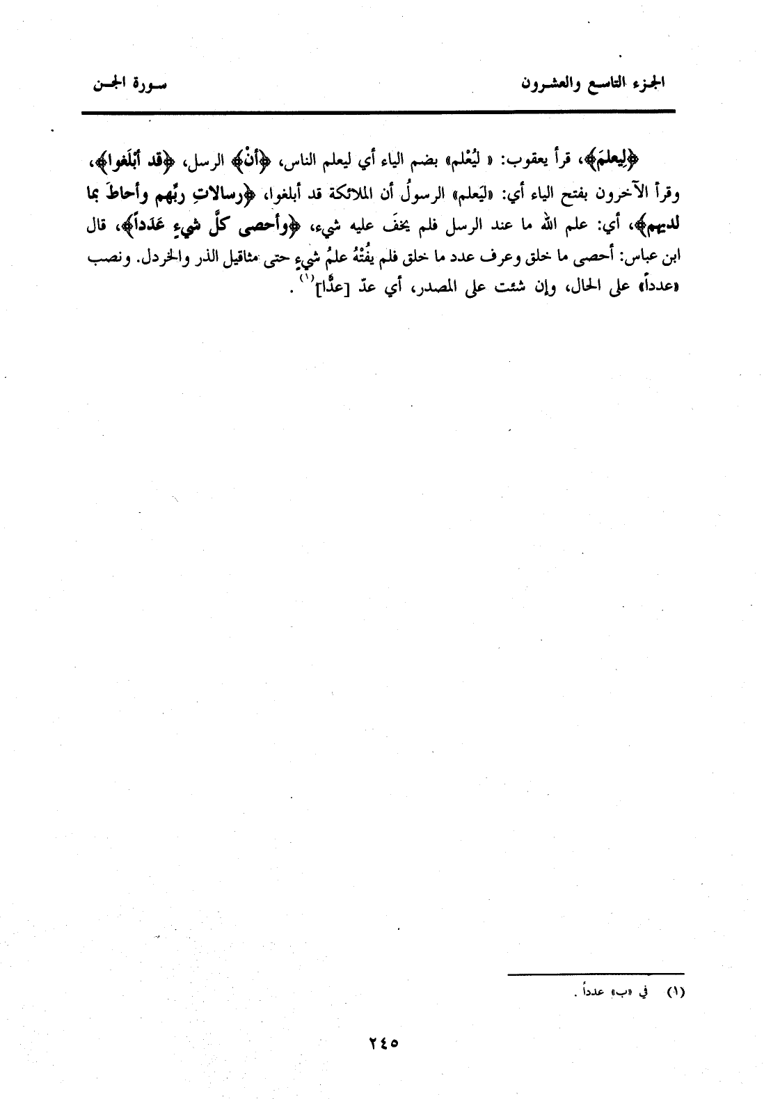 {لِيَعْلَمَ} قَرَأَ يَعْقُوبُ: "لِيُعْلَمَ" بِضَمِّ الْيَاءِ أَيْ لِيَعْلَمَ النَّاسُ {أَنَّ} الرُّسُلَ {قَدْ أَبْلَغُوا} وَقَرَأَ الْآخَرُونَ بِفَتْحِ الْيَاءِ أَيْ: "لَيَعْلَمَ" الرَّسُولُ، أَنَّ الْمَلَائِكَةَ قَدْ أَبْلَغُوا {رِسَالَاتِ رَبِّهِمْ وَأَحَاطَ بِمَا لَدَيْهِمْ} أَيْ: عَلِمَ اللَّهُ مَا عِنْدَ الرُّسُلِ فَلَمْ يَخْفَ عَلَيْهِ شَيْءٌ {وَأَحْصَى كُلَّ شَيْءٍ عَدَدًا} قَالَ ابْنُ عَبَّاسٍ: أَحْصَى مَا خَلَقَ وَعَرَفَ عَدَدَ مَا خَلَقَ فَلَمْ يَفُتْهُ عِلْمُ شَيْءٍ حَتَّى مَثَاقِيلِ الذَّرِّ وَالْخَرْدَلِ. وَنُصِبَ "عَدَدًا" عَلَى الْحَالِ، وَإِنْ شِئْتَ عَلَى الْمَصْدَرِ، أَيْ عَدَّ [عَدَّا] (1) .
